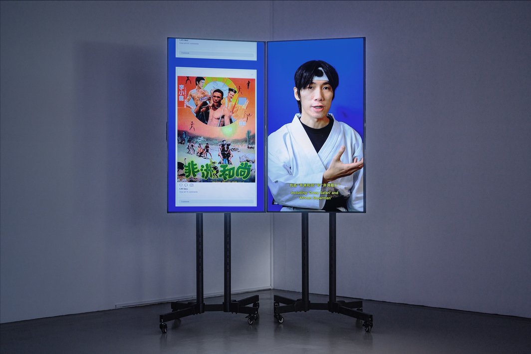 《功夫流感》从疫情初期亚洲面孔在欧洲的遭遇为叙事开端。在左屏上下滑动的图像里,我们看到了已经快被遗忘的特朗普夸张的“Kung Flu”形象(被拜登关于撤军的演讲取而代之),功夫的哲学里对进攻和防卫的东方式解读,黑性(blackness)在西方思想和社会领域造成的冲击和改变对比下,黑人牙膏、黑人问号等种族色彩符号在亚洲的持续流行。右屏上身穿空手道服装的艺术家的演讲式表演调动着这一切,让现实变成信息,变成知识和粘结不同知识领域的中介。但在某一刻,你必须做出判断,左和右,谁在支配谁的叙事?当现实感觉的更新频率让艺术(更确切说是当代艺术)捕捉感性经验的手法相形见绌,一种近期萦绕不散的对艺术的倦怠感开始变得具体化。