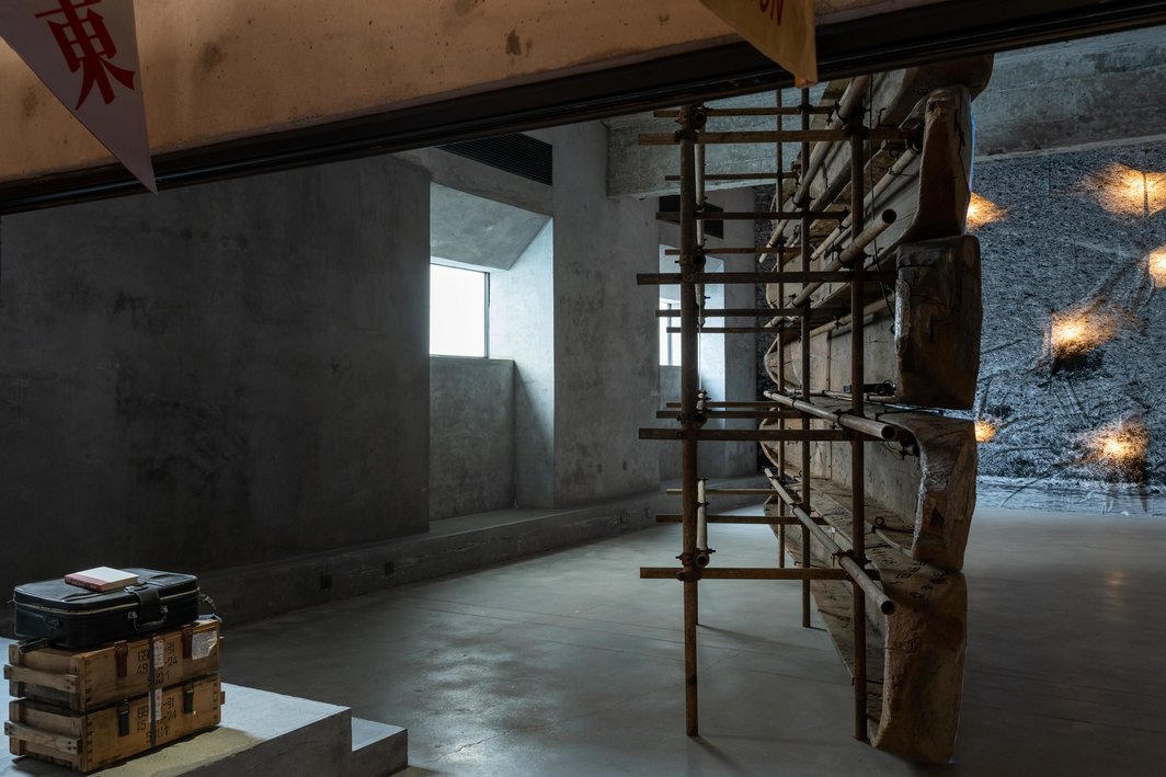 展览入口处,平面设计师张烁根据丹东市(原名安东)不同历史时期文字和视觉宣传风格而设计的各色幡旗与标语(《欢迎来到安东》,2022)以一种略显戏剧化的方式,引导观众步入这场以丹东籍艺术家为主、聚焦地缘文化的群展。展厅本身迷宫般的空间设计契合了此次展览的主题及野心:通过跨越不同媒介、不同年代的创作将丹东这一东北亚要塞之地的复杂历史和当今的城市肌理微缩至实体的当代艺术空间内呈现。