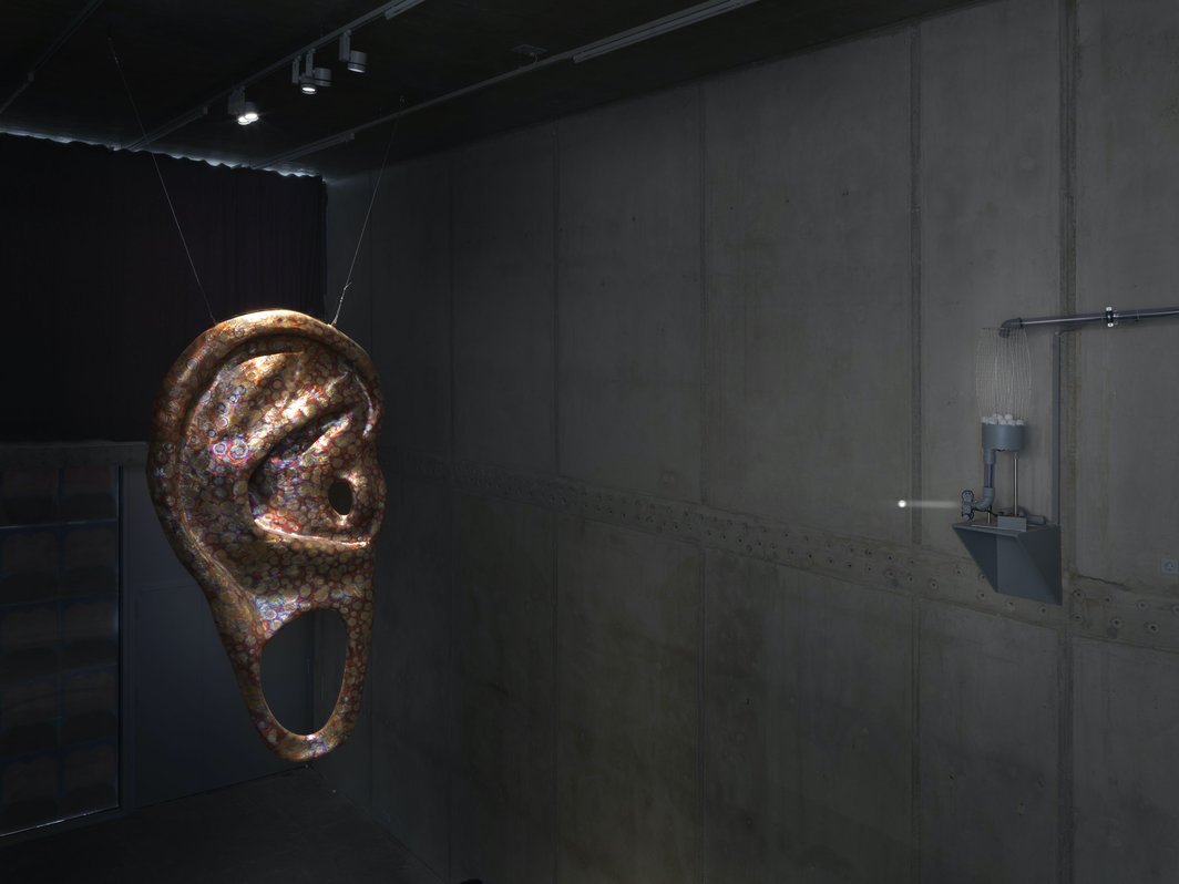 展厅两层的地下空间对于“耳屎”来说几乎是量身打造的。如果说海报将这间艺术机构包裹成了黄炳的头部,观众走进展厅往下探索时则仿佛在通过耳道越来越深入艺术家的脑内。走在第一段向下的楼梯上,观众面对的是一个悬挂在空中的巨型金属耳朵,有着珊瑚般的彩色纹样。巨大的耳垂让人想到佛祖的智慧,但上面有一个几乎和耳垂一样大小的耳洞。在无自然光源的空旷混凝土展厅内,被射灯照亮的耳朵如吊钟般高大庄严。此时,如果幸运的话,你将听到清脆的“钟声”:每隔一段时间,一颗白色乒乓球会从墙上的自动投射机中飞出,对准耳朵,其中少数穿过了耳洞落在地上,大部分撞击在耳朵的金属外壳上,发出轻巧但有力的响声。和巨大的耳朵相比,乒乓球如飞落的耳屎颗粒。像作品名称所暗示的,每天无数试图从耳廓进入耳内的外在声音是纯粹的“blah-blah-blah”,或用黄炳的话,“成功穿过耳膜的都是废话,耳屎才是智慧。”朝向外界的耳朵是社会文化话语的承载物,朝向体内的它则是一个可渗透的、敏感的、性感的器官,同时也是通往大脑的直接通道。在这个空间中,令人颤栗的宗教气息之外,还有日常政治抗争的肉身隐喻——我们通过最私密的身体通道与艺术家的时空联结。