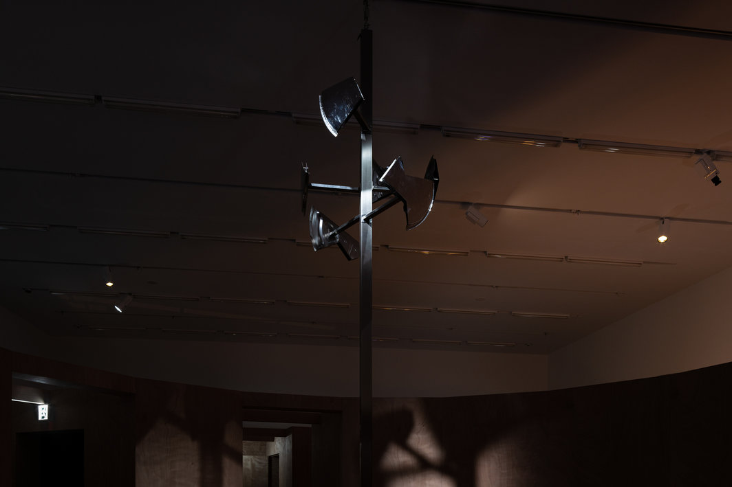 一楼“迷宫”的中心是高倩彤的雕塑装置《为了更广阔的视野》(2017):一根几乎触碰到天花板的不锈钢柱,顶部延伸出几片被切割的广角镜。本应该开拓视野的镜面在被拔高后丧失了原有功能。它保持着高傲的姿态俯视整个空间,像是冰冷的全景监视器。在三楼的相同位置上,戴恩·米切尔(Dane Mitchell)的《事后》(棕榈) (2019-2022)用富有亚热带风情的人造树影掩护了另一组无情的信号。树叶下隐藏的喇叭不间断播放着已不复存在的事物: 倒闭的书屋,消失的语言,灭绝的生物……语调冷静的诵读音覆盖了整个环形中庭。