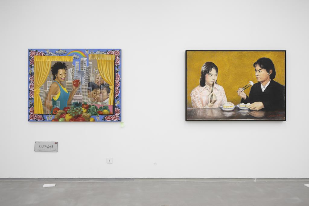 王兴伟,“王兴伟在上海:2002-2008”展览现场,2022. 左:计文于,《苹果红了》,2006,布面油画,114×146cm;右:王兴伟,《无题(吃蛋糕)》,2002,布面油画,107×154cm.