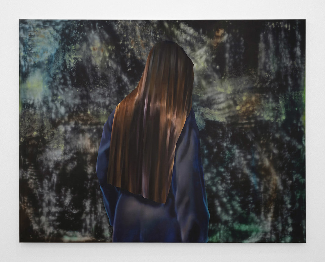 无论是人物、食物,还是植物、器具,莫尔克画中的图像总是边缘处轮廓分明,中间则是模糊色块以及光影对比的互相角力,使得这些图像的表面更像是算法生成的材质或表皮,或者电脑游戏中可进行任意剪切拼贴的素材。比如《艾利卡》(2022)等作品中人物面部的反光和阴影,以及如金属折叠面一般拼接起来的头发。画中较为抽象的背景暗示着数据的流淌,或是自然中的有机纹理。有时,这些看似明晰的形象在部分作品中发生了微妙的变化:人物面部及身体局部淡入背景中,如同身体逐渐消失后留下的电子魂魄,这一点在《桑德拉》(2021)里尤为明显。