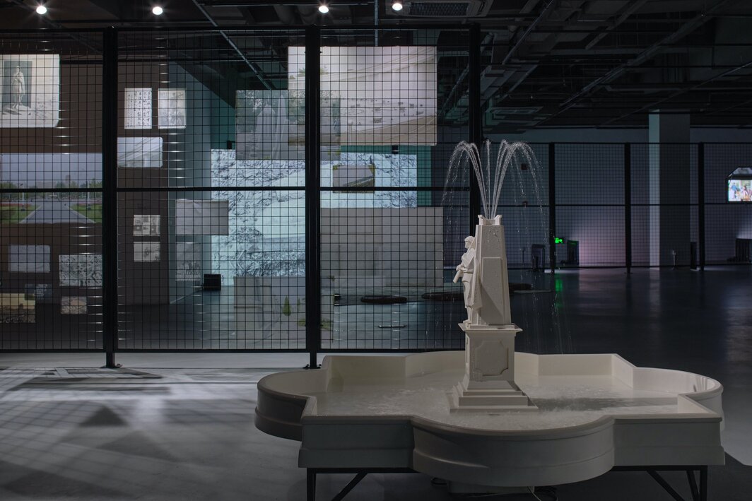 “共同的”,2022,展览现场. 胡伟,《为公共集会(邂逅)的提案》(局部),2019,档案、照片、喷泉装置,尺寸可变,图片由艺术家提供.