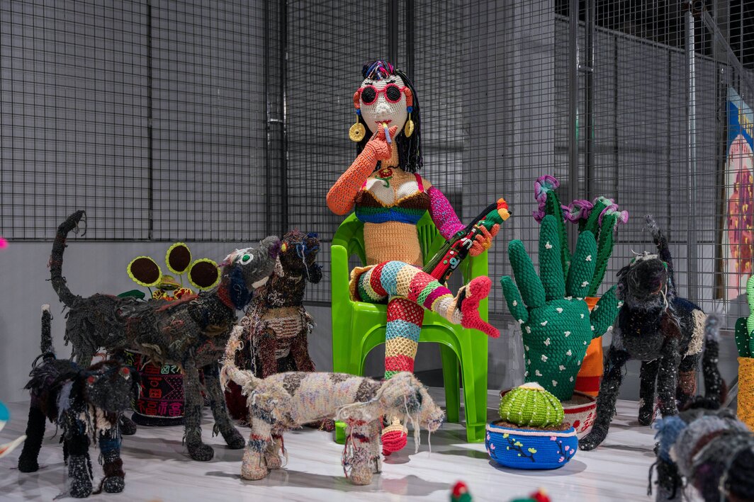 这场历时七年的“表演”过程被片段式地记录在展厅上下两层分布的影像中,对整个项目形成了阐释性的补充,并尝试为展览作品流露的矛盾感加以注解,比如从未离开过小镇的阿姨如何在艺术家的引导下想象比基尼的样式和联合国的形象。这也让观看者意识到眼前所见的并非是一场全然即兴的表演,不同主体的交流、协作与干预充溢于空间中结成新的创作集体。作为赞助人的乔小幻亦是一个蕴含矛盾的人物——一面进行着完全迎合于大众市场的雕塑创作,一面悄无声息地资助着这个无利润回报的小镇集体创作。展厅的二楼空间完整展现了乔小幻不同时期的雕塑作品,这些艺术形态难以界定的雕塑被临时地摆放在木箱和木架上,维持着一种亟待售出的状态。对比之下,一楼展出的“小芳”计划反而更像是常规意义上的艺术作品,二者所呈现的样态差异透露出胡尹萍对当下的艺术商品化现象的揶揄式讽刺。