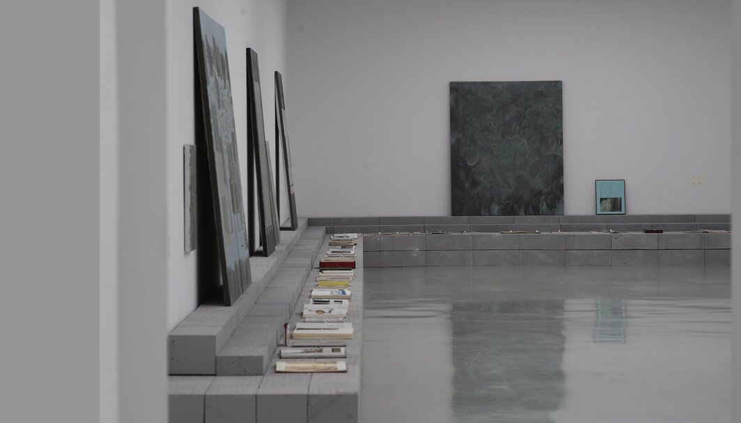 就展陈而言,贯穿第二和第三展厅的灰色加气砖可以说是一次别开生面的尝试。将画作从白墙上卸下来让人感到一种有如参观艺术家工作室现场般的亲切,但统一的设置及其与书籍配对摆放的方式也令人联想到某种样板间结构,在其中被凸显的,与其说是创作的过程,毋宁说是成品本身。同理,布朗库西、纽曼等现代主义时期艺术家的画册和书籍,古尔德演奏的巴赫黑胶与作品产生的互文关系无疑为理解卜镝的参照系统提供了直观且便利的条件,但同时也不免让艺术家背负某种站在巨人肩上的嫌疑。或许从第一章中看似宫廷一景的局部几何立体处理,到之后章节对具体图像描摹的摒弃,厘清这一条线索就足以阐释艺术家对画面秩序化推进的方向。