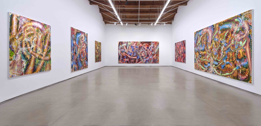 劳伦·奎因(Lauren Quin)个展“Sagittal Fours”第一眼看来炫目鲜亮,明晰直白。当前对新生代画家作品的常见描述,如金属光泽、数码拼贴、迷幻感也是在这里最先联想到的标签。不过,在展厅多停留一会儿, 就会发现视觉外的其他感官也被奇异地调动了起来。例如,越是走向位于空间尽头的作品《Cut Howl》(2022),画面里传来的喑哑低吟就越是可辨;而《Bone to Pick》(2022)形似蜘蛛爪、人类手指以及神经元的粘稠触须好像正向画布外缓行延展,几乎将身体牢牢攫住。此时七幅作品便不再是荧荧明快的光影色团,而是从三面展墙合围着观者,形成共振同频、但动荡破碎的场域。