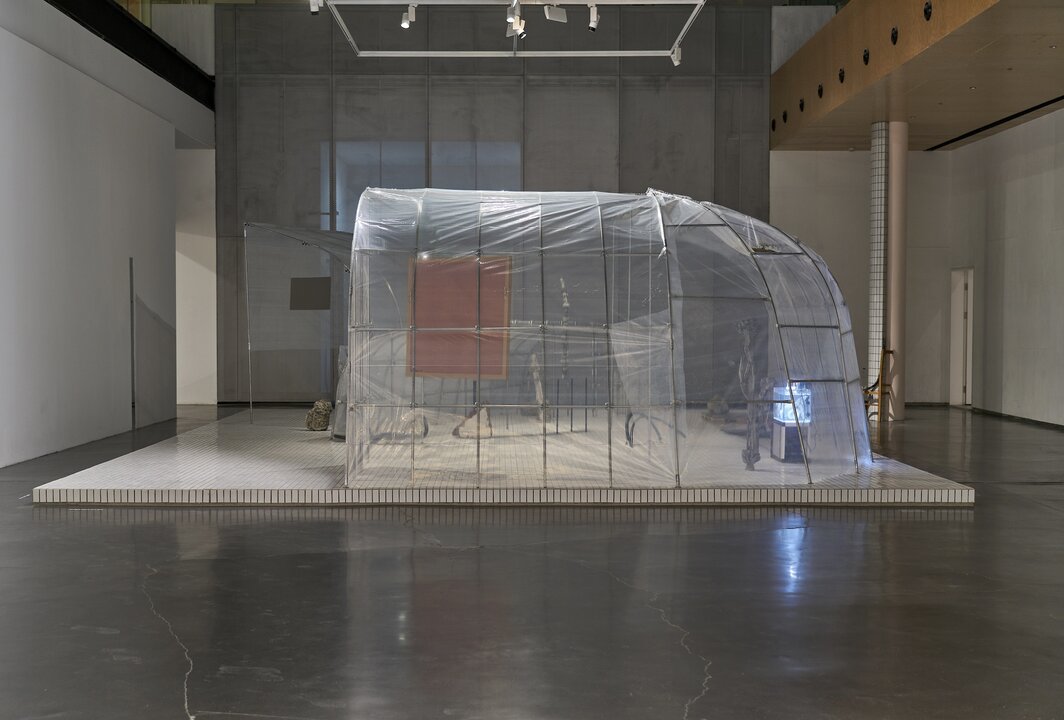 张如怡在北京UCCA尤伦斯当代艺术中心的个展“低声细语”呈现了艺术家受委任创作的二十余件新作,在日常性与工业化的辩证法中编织出一处全新景观。初入展厅,观众首先被空间装置雕塑《沙漠并不悲伤,也并非无人居住》(2022)吸引:在这座由金属支架和透明塑料薄膜搭建起来的、类似花圃的半开放结构里,散放着若干更小型的其他作品。塑料薄膜的透明性看似对外部元素来者不拒,却是生长于其中的“生物”实现内部循环的保障。诸如此类的矛盾似乎暗示着艺术家态度上的某种暧昧,就像她在谈及作品标题时所说的,沙漠的极度干燥可以隐喻“自我反观”的冷澈,也可以成为认知的障碍。进入内展厅之前,观众被邀请透过墙上的猫眼窥探嵌入墙体中的小型仙人掌,而退出猫眼视域后,你会在垂直的镜面中遭遇自己作为窥探者的面庞(《短暂的凝视》,2022),这似乎是某种隐秘的提醒:人造景观亦会长久地回望着人。