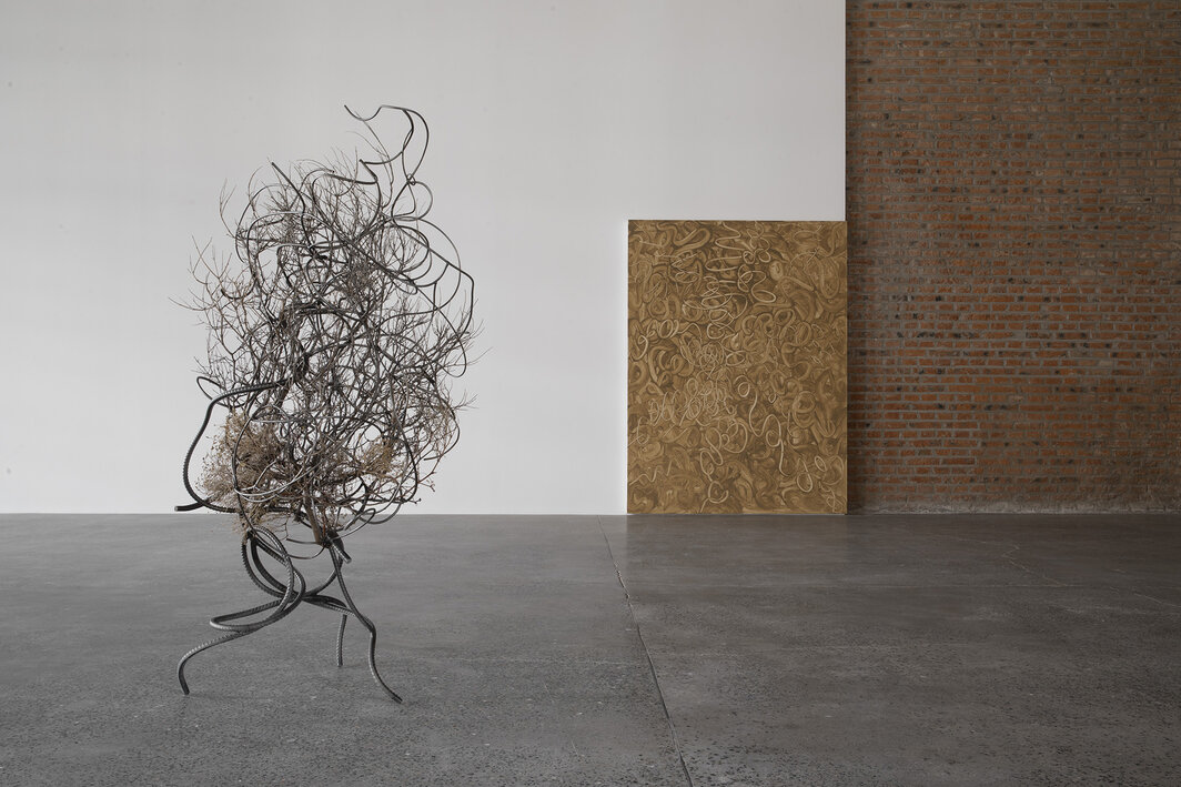 同样,“勇士”系列也让人忍不住产生一连串拟人化的联想和比喻:有如火焰般的芦苇,浑身长满种子到处播撒的臭蒿,有点“反动”的刺头苍耳,翩跹蝴蝶般的牵牛花,不屑于着陆的蒲公英,以及随处“游击”的风滚草等等。它们被半透明乳液状的水性封闭漆包裹着,与拧转成藤蔓般的钢筋条互相缠绕,共同构成一个个独立的造型体。将钢筋弯折成绕指柔代表了一种对压抑的释放,一种情绪的宣泄。正如这些野生的植物被定性为“杂草”,其中没有任何讨论余地,是一种来自人类的单方面判决,也是拥有命名权力的生物对维护生存需求的生物的一种阶级裁断。