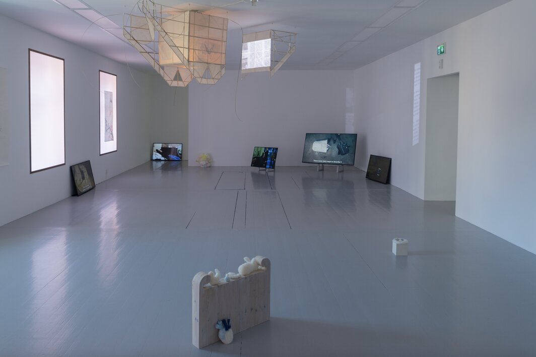 映照在这些光影下的朋友们也都有各自的坐标和颜色。Park Xun青蓝色油画勾勒着韩国完州郡荷塘里波光粼粼的茂密生态(《Lotus Pond》[荷塘],2023);旁边,Emilia Wang随着1928年帕乌·卡萨尔斯(Pablo Casals)演奏的大提琴曲《天鹅》哼唱,她的毛毡软雕塑散落在地上,兔子、石头、心脏(《dream headboard》[梦的床头板],2023)。展厅另一头,地面散落着陈巧真和徐智彦的五频道短片,每个屏幕记录一位香港朋友的日常,以及在社运背景下,他们与身边物品的关系与记忆(《有关日常物的对话》[A conversation about our undulating things],2023)。与这些录像彼此相望的,是增盐太郎(Taro Masushio)用黑白摄影及不同视角所记录下的日常物,微妙地测验着现实的不同侧面,以及不同现实彼此重叠、干扰的可能性。展厅外的咖啡室里,尹景辉的8毫米胶片录像记录了艺术家与五位香港高中生共同使用一部录像机所生成的多重视角(《我和我的世界》[Through the window I saw my world],2023)。二楼的阁楼空间里,莫小菲与Cici Wu合作书写的虚构故事集成为她录像作品的蓝本,录像以Cici为主角之一,展开两段从 “缺失”与“消失”的现实事件延伸出的梦呓叙事(《Lovers Revolt, Lovers Revolve 1&2》,2020-2023)。