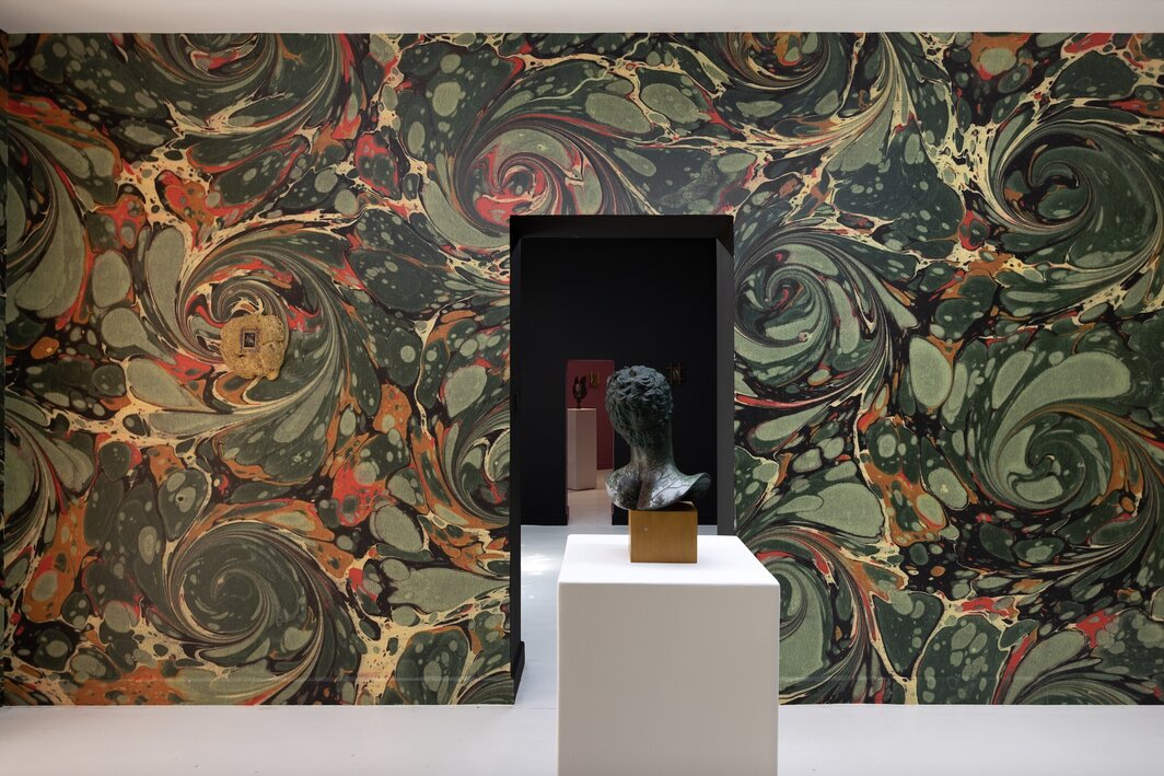 在早期作品中,克里斯·吴曾将文艺复兴的图像细节绘制在宜家毛巾、橄榄球、鞋底或轮毂盖上,以一种“年代错误”般的方式制造知觉冲突。然而在此次胶囊的展览上,他将另一些“在时间中生长”的现成品——从海扇、蝉、鸸鹋蛋、贝壳、玛瑙切片到古董树瘤板——作为画布,巧妙利用材料的质地、颜色、形状乃至名称词源及其象征,来展开这场嫁接古今的创作游戏。