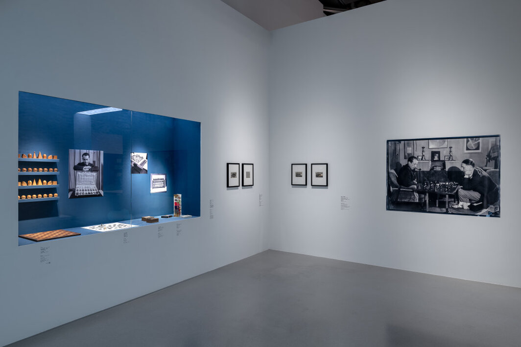 激浪派艺术家跳脱日常秩序的途径之一便是创造应用新规则的棋盘和桌面游戏,这类作品在“盒中之盒”与“国际象棋与其他游戏”章节中得到了集中展示。展览对于装置作品的选择也耐人寻味。例如,在乔治·布莱希特(George Brecht)的《三种布置》(Three Arrangements, 1962/1973)中,艺术家为作品中隔板、衣帽架、餐椅的布置方式绘制了详细的说明画稿。尽管他故作认真地对摆放物品的颜色、材质等进行了描述,但作品重点显然不在物品本身承载的隐喻,而在于布莱希特设定的游戏规则,以及当这些规则作用于现实时,周遭感知秩序出现偏移的模糊时刻。正如他在手稿末尾的自白所言:“恐怕没有更好的方式能说明生活/艺术态度之间的矛盾了!”而不远处装点着彩色鸵鸟毛的俏皮腰鼓椅(《凳子》,1975),则是多萝西 · 伊安诺(Dorothy Iannone)在好友布莱希特的鼓励下,将其二维绘画宇宙中的元素带入现实的结果,流露着两人作为“破次元壁”共谋者的会心一笑。