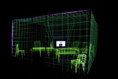 西蒙•伯尔奇、《爬出残骸》、 2010 钢筋、尼龙绳、荧光色、电线、UV灯、电视、耳机,尺寸可变。