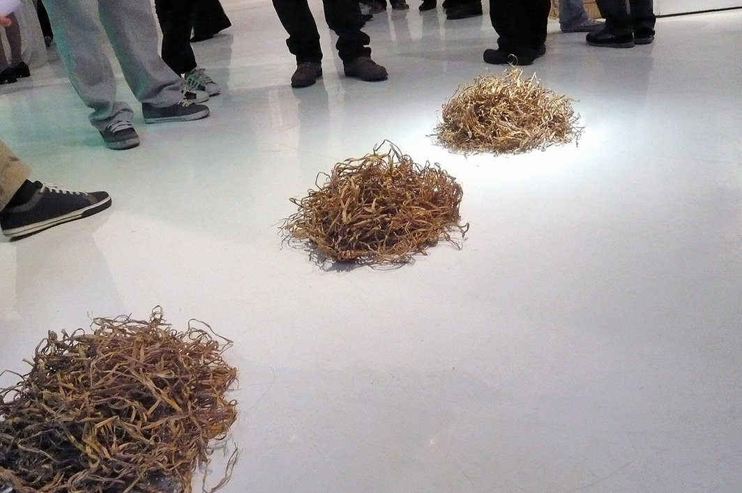 有趣的是,本次展览的香港部分作品,显示出相当明显的政治针对性,在策展人郑怡敏(阿金)看来,其策划重点不在某地主义,而是以香港与广州之间的历史关系以及演变为出发点。其主题“行路上省城”大意为“走路去广州”,这是四十年代初香港日治时期,日本执行“归乡政策”,大批香港市民被逼返回大陆的现象。如今该词已经变成愚蠢的代名词,该词暗示了香港人对内地政治的微妙心态——既担忧又不满。因此,不难理解为什么展览中会出现反高铁的作品,还有一个名为《禾鞋》(数对禾草做的鞋,依次朝着南面摆放,一双比一双散乱,最后一双只剩一堆禾草)的作品,简单直接——香港艺术家更喜欢在作品中表达政治态度。