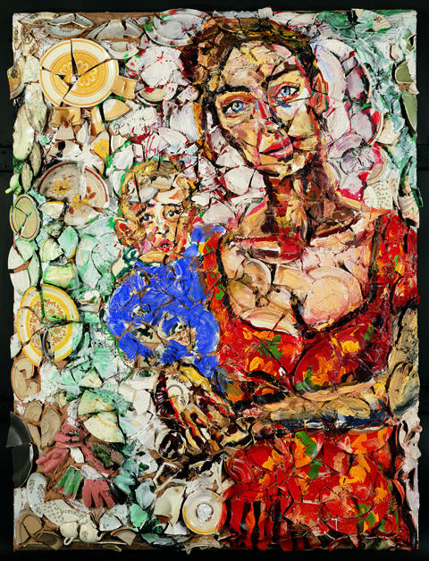 朱利安·施纳贝尔,《奥拉慈与塞的肖像》,布面油画及瓷碟,1994年,203 x 152 cm