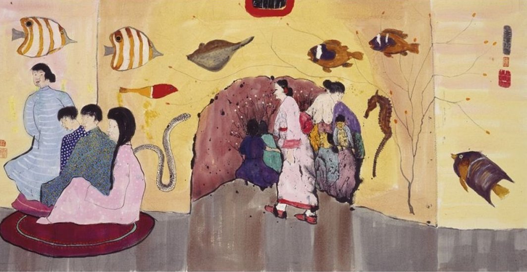 1930年代,陈先生20来岁,当时虽未接受正统学院的美术教育,但彼时教育资源相对匮乏的年代,亦有自觉和热情不断自学,并接受英国伦敦印务美术学校的海外函授课程。之后又不断组织艺术社、画社。这些勤勉摸索的过程,似乎都是这个被后世谓之“素人”画家拼劲力量,不愿沦于庸碌的表征。后来更活泛的教学相长的路途中,则更广开源路。学院的章法纵然功底深厚,但没有框束的艺术法门或许更可上天入地,想象绝伦——“鱼龙混杂”的海底,蟹蹲鱼腹,蜂鸟远跃。