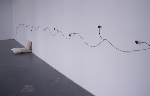 沿着墙面蜿蜒向前的是颜峻的《牵牛花》(2011-12),一些小的类似花朵状的小麦克,在现场播放特定地点被录下的声音和音乐。创作者想引导观众去聚精会神地聆听而不是仅仅去听,但这番心思恐怕在这样一个高雅空间里会化为泡影。另外一处,是殷漪的《你可以无数次聆听同一条河流》(2012),实地录下的是一条流动的河的声音,这件作品对赫拉克利特的关于流动与变化的名言进行了另一种诠释。还有一件将声音移位的作品是是劳伦斯•英格力士(Lawrence English)的《微蓝》(Slender Blue, 2010),表现了来自南极的声音景象。与之相随的录像里延伸的时间,迫使观众的注意力不得不集中在那片来自另外一个世界的音响风景中。