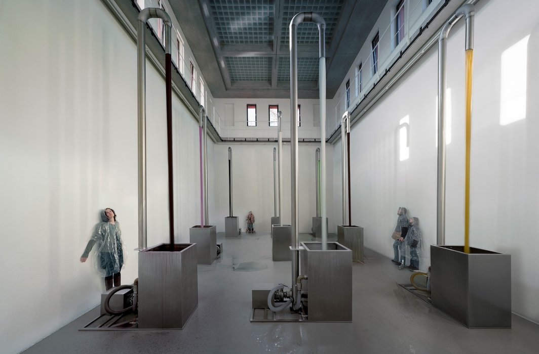 高潮即将到来于那场装置的鸡尾酒会。但奇怪的感觉再度降临了。这个水浪激荡,电动马达和泵不停轰响的空间,令人好像走进工厂。几乎有两层楼高的9个大怪物,不停循环喷射着各色液体:化妆水、橙汁、薄荷浓缩液、墨水、甘油、葡萄汁、意式浓缩咖啡……我好奇地问工作人员:“这能喝吗?”“原本当然可以,但目前被稀释,且为了保存里面加了防腐剂,天热嘛”,他答道。混杂的空气里挥发着酒精和甜腻的味道,逼得人悻悻走掉。
