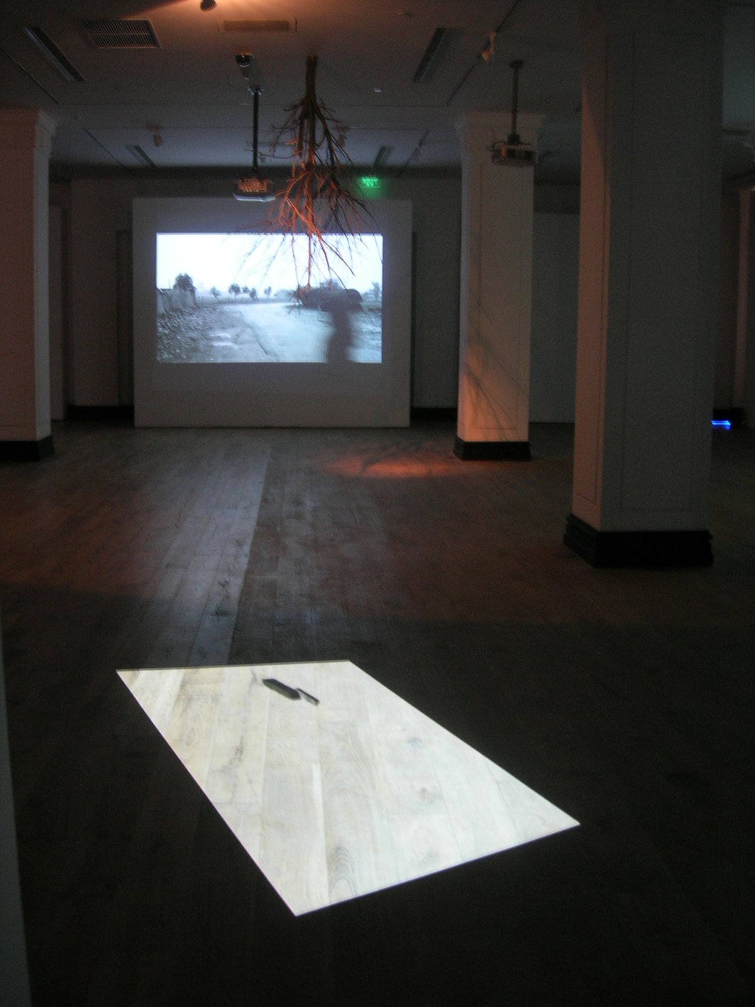 展出的六部录像皆为今年的新作,它们或投于墙面,或投于地上、或聚焦于廊柱前,因距离和观看方式呈现出迥异的视觉效果。无休止的长镜头舒缓平稳,传达出记录的气息,同时给人遥不可及的距离感。一路从四川到德国卡塞尔再到上海的邱黯雄,在迁移、漂泊与各种文化差异之间,应是深深体会到乡愁与忧思的难舍、深重。录像作品中,四川的田野、道路、工厂、废墟悄无声息地存在和消逝。山川乡野的绿色沁润,人迹可寻的街景荒芜,而漫天的飞雪、不知方向的风,还有焚烧而起的轻烟则赋予了现实场景一种非真实、不可触的虚无感,宛如天地悲悯。由声音与玩具乐队的主唱欧波为展览而作的声音作品独立循环播放,分段环绕整个空间,十分贴合录像创设的情境。