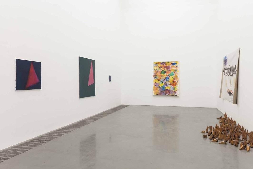 或许是由于中国艺术史中从未有彻底的现代主义阶段,艺术家们即便继承抽象画削减到极致的手法,也不会去强调绘画绝对的自足性。周思维一遍遍在画布上叠加较高透明度的明亮颜色,形成沉着却清澈的复合色调。在此基础上,他以《帆》命题的作品呈现同一主题(宛若船帆的红色三角形)的变奏。三幅绘画在尺幅、形状、笔触、颜色上的对比一目了然,艺术家以此展示绘画思路的变化,倒不会鼓动观众联想人与宇宙新型关系或神秘主义主题。