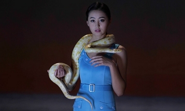 杨福东常被赞誉刻画了“知识分子的情怀”,但这次的作品中,因为出场人物身份暧昧,“知识分子”始终没有现身——至少画面中没有找到这些人是知识分子的证据,但“情怀”却无处不在。事实上,情怀弥漫在一楼二楼所有空间中:对荒凉的情怀、对复古的情怀、对战争的情怀,以及对女性的情怀。在多屏录像《天色·新女性II》(2014)中,相貌姣好的年轻女子们身着泳衣,被置于世界尽头的“仙境”,她们玩耍,互相嬉闹,在水池里湿了身,加上影像中不断出现的稍微有点“邪恶”的女性意象:蛇、爬虫、开口带齿纹的海螺,景象美得太像一场宏大绚烂的性幻想。艺术家说“新女性”拍的是女人的秘密以及她们收到的神秘礼物,然而无论是在《天色·新女性II》还是在《关于与一切未知的女孩:马斯瑟》(2013-2015)中,女人被赋予的,仅仅是不加修饰的男性凝视(male gaze)而已。