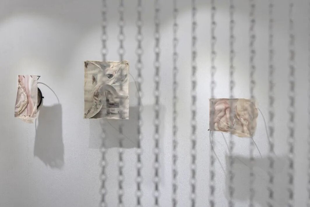 展览试图以女性主义立场动摇普世性客观真理的立场——艺术家自述和策展文本都有意援引唐娜·哈拉维(Donna Haraway)的“处境知识”(situated knowledge)理论,强调具身性以及从局部出发的认识论。同样显而易见的,是洋溢于绘画装置中的身体感官性。李清美通过材质的碰撞和变装,颜色与图案的流动隐喻,呈现对私人记忆的诗意再现。她用矿物颜料绘制的抽象图案形似纠缠交汇或无限接近的胴体抑或花朵(植物性器)。与霍洛韦尔(Loie Hollowell)或欧姬芙(Georgia O’Keeffe)的身体性隐喻不同,李清美偏好柔和暗哑的色调,色泽接近肌肤与血液,也更显阴郁与阴柔。其中一组作品由影像转印、手工纸与丝绸等软性材料叠构而成,在暧昧的画面角落,几颗金属球形钉赫然凸起;画作后方则以金属支架支撑镜面,映射出覆盖画作背部的材料与图案。正与负、远与近、平面与立体、柔软与暴烈、覆盖与穿透的交错张力,激发了围绕身体和肌肤的多义性想象,以及一种去中心的辩证观看。另一些画作和雕塑则使用深色纸浆摹拟金属,造出既似植物枝干亦似人体筋骨的爬行藤蔓,将柔软的纸异化为突兀、触目、近乎可怖的硬质形体,酷似生物的躯体或残骸。观看这些纸张游戏的解构、再造和异变,无疑正是一种“观皮”——艺术家邀请我们用目光触碰其经冥想调解后创作生产的感性记忆档案。