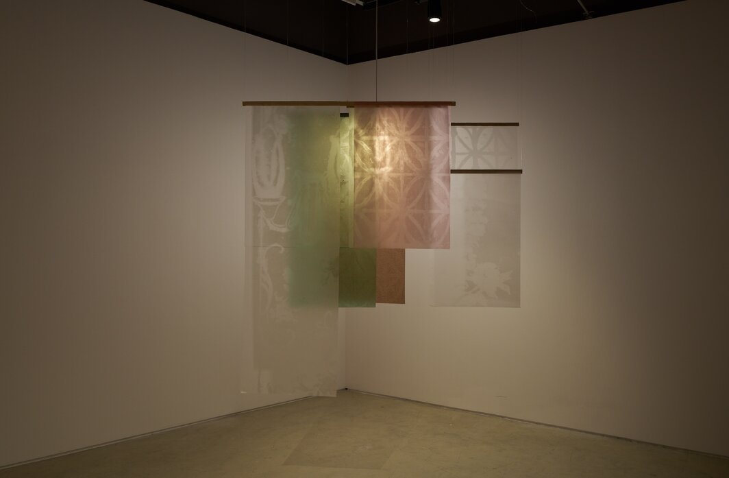 艺术家此前在潮汕地区走访期间,当地的铁艺窗花、供中老年人幽会共舞的“黑舞厅”内饰都为她探索“欲望”如何在文学以及空间中被塑造提供了灵感。但我们在占据展厅主要位置的“窗扉”(2025)系列里看到的,却并非对这些文化符号的直接挪用。艺术家以油纸为核心媒介(其独特的渗透性与《蜜场》里的陶瓷材料形成呼应),在空间中构建了一种“藏”与“露”的视觉辩证:油纸上的窗花纹样并非简单地附着其纸表面,而是仿佛被嵌入材质内部,呈现出一种悬浮于虚实之间的曖昧状态。这种雾中看花的效果,被该作所使用的催情香油(据称最早是由艺术家与韩国的Moho Space共同调制)进一步强化。然而,当观者受气味牵引而趋近,这一近乎本能的嗅闻行为,却并未将人引向更丰富的叙事,反而触及了作品中被刻意留有的某种形式空白。进一步说,油帘图像在遮蔽与显露之间的游移,虽能制造一定程度的心神不宁,但其对东亚文化中“欲说还休、欲拒还迎”的叙事技巧的再现,较之晚清文学中绵广的心理厚度,仍显得仅止步于迂回不尽的风致本身。