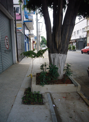 在作品《十字路口》(Cruzamento,2003年实现于里约热内卢,2004年于圣保罗)中,艺术家雷娜塔•卢卡斯(Renata Lucas)给一个交通繁忙的十字路口铺上胶合板——一次看似简单实际意味深长的行动。铺在柏油路面上的木质胶合板以其反常的颜色和质地为形式和几何图形赢得了新领地:一个奇怪的形状——十字或加号,但轮廓更加圆润——在街面像浮雕一样显现。圈定该轮廓的路缘在这里可被看作负空间,而交错的人流仿佛以宽线条勾勒出一个带有明显隐喻语体的永恒“十字”。《十字路口》通过赋予汇聚和流动这样的抽象概念以形式,几乎成为一种标志,象征转换的可能性——这种转换叠加于我们这个受石油化学制品驱动的系统之上,也与之共生同息。