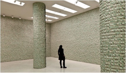 费尔德曼是2010年Hugo Boss奖得主,从而取得了2011年在古根海姆举办展览的资格,也获得十万美元的奖金,他将自己的奖金用于了更为普通的作品的创作。十万美元分成一块钱的钞票,整整齐齐地交叠着覆盖住了展厅的整个墙面。这番原原本本甚至是有些书生气的举动,产生了一种意想不到的忧郁效果,也在美学上构成了具有诱惑力的体验。