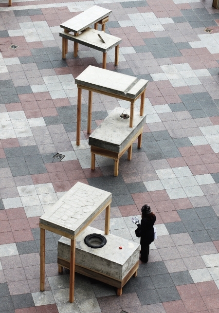 另外一些艺术家采用了极简的形式主义作为其话语的出发点:例如Amalia Pica的装置《维恩图(聚光灯下)》(Venn Diagrams [Under the spotlight], 2011)。其中,运动检测器打出的重叠彩环是整个作品的重点,反映了1970年代阿根廷的意识形态妄想史。正如展览的墙壁上写的那样,当时政府禁止阿根廷小学在教学中使用维恩图,因为“怕引起集体煽动模式”。活跃在纽约和开罗两地的艺术家Iman Issa的作品《作为以反强权精神树立的纪念碑的雕塑的材料》(Material for a sculpture representing a monument erected in the spirit of defiance of a larger power,2012)采用了缩小版的方尖碑之类的象征形式,从而让纪念碑焕发出新的意义。