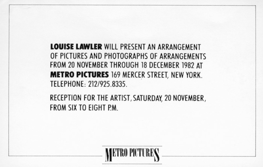 展览结束不久后,维勒和詹妮尔·芮泰琳(Janelle Reiring)在纽约SoHo区创立了商业画廊Metro Pictures。画廊代理艺术家名单与“图像”展的参展艺术家部分重叠,包括若干被认为与“挪用”概念息息相关的艺术家,以及若干探讨摄影媒介本身的艺术家,劳勒就是其中之一。我为“图像编排”采访劳勒时,她对这段时期的说法是: