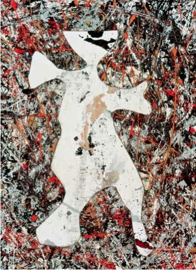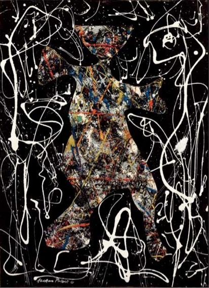 所以,在奥登伯格眼里,波洛克的颜料是一种“物”。波洛克把纽扣、硬币、钉子、烟头等物品嵌进画布更加凸显了颜料的物质性(及其反光性)。从这个角度看,《切割形象》(Cut-Out Figure)(而不是《切割》)就变得很重要了。《切割形象》不再是观众视网膜上的一处空白,一个盲点,而成为一种“物”,一个物件。如果该作品真的像奥哈拉所说的那样曾经被装裱在木板上并悬挂展示的话,那么上述事实只能变得更加突出。如此一来,《切割形象》不仅反驳了弗雷德的视觉论,跟卡普罗的整体论也形成了鲜明对立,后者将波洛克的图面视为“一种自我释放的艺术,它走出自身边界,试图填满我们的世界。”