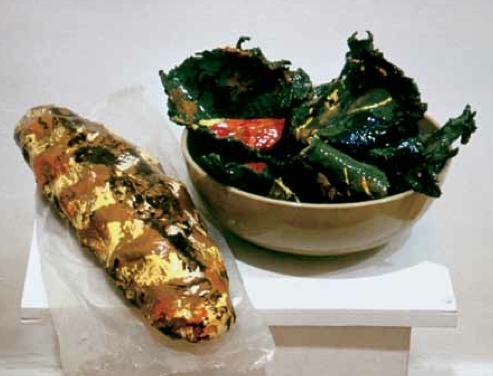 波洛克作品中跟奥登伯格《商店》系列浮雕最接近的例子是一座完成于1951年左右但如今已被销毁的雕塑。在这件作品中,波洛克将浸过胶水的宣纸糊在形状不规则的铁丝网框架上,然后把得到的成品放在一块门板上展示。尽管并未完全去掉形象的残迹——《艺术新闻》(Art News)和《艺术文摘》(Art Digest)的评论家都将其描述为一只“扭曲的⋯⋯魔鬼”——但波洛克的雕塑仍然将抽象特征保持到了最后,其初始的能量诞生于(或回落到)一团暧昧不明的形状当中。相反,爱登伯格对形象的追求更加直接,以便重新激发抽象与再现之间不稳定的动态关系。对奥登伯格而言,“深化媒介的复杂性”意味着将二维与三维、绘画与雕塑放入一系列相互关系中,表面上的绘画常常起到强化其下形状和轮廓的作用,但有时也会与之产生严重冲突,比如《收银机》和《绿色沙拉与意大利面包》(Green Salad and Italian Bread, 1962)中的面包。奥登伯格《商店》系列中最具挑战性的部分物品延续了为《切割》和《切割形象》提供原动力(但在《网之外》中被消解)的矛盾对立,而且不仅囊括了抽象与形象在图像层面的区别,还进一步延伸至绘画与雕塑两种不同的艺术媒介。正如奥登伯格自己所说:“形象v.s.非形象的区分方式太傻。对抽象艺术的挑战必须比这更深入。”