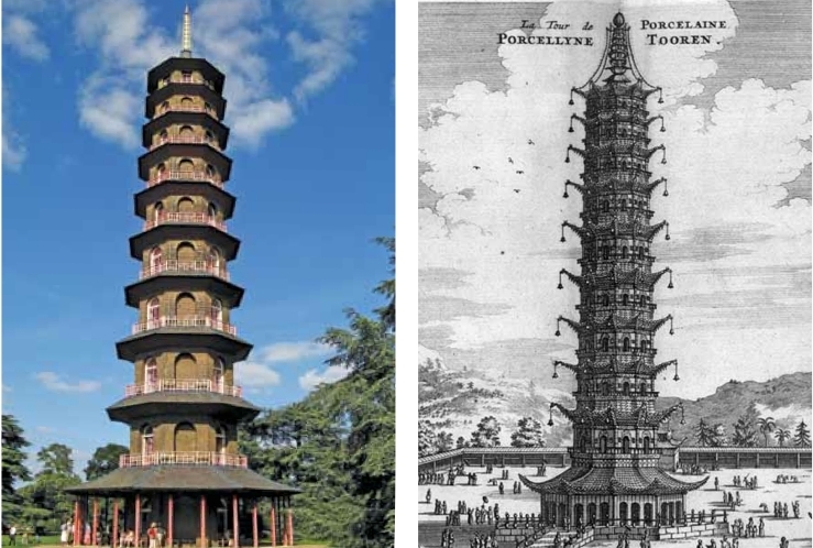 钱伯斯自诩这座至今依然屹立的十层中式木塔是以明朝年间(1368-1644)建造的南京琉璃塔为原型,尽管我们都明白,钱伯斯绝对没有亲眼见过南京的那座建筑奇迹。他可能只是通过荷兰驻京使团管事纽霍夫(Johan Nieuhof)1655年的简短记录对其略知一二,而纽霍夫的书在伦敦出版是几乎一个世纪以前的事了。钱伯斯的设计更多应该是参照了广州码头附近黄埔岛上的普通木塔,当时那里是欧洲船舶进入大清帝国的必经之地。钱伯斯在他的文章《中式建筑设计》(Designs for Chinese Buildings,1757)里写到,“我并没有假装精确重现了那座建筑:天衣无缝地将中式建筑照搬下来,对欧洲艺术家来说意义不大。”这样看来,完全照抄中式塔绝不是钱伯斯的目的。他更希望制造一种风格上的相似,由此在人们心中唤起强烈的联想。