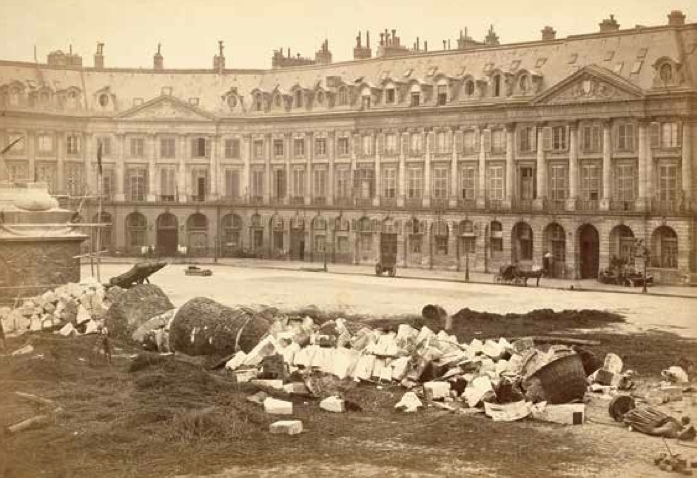 如果说城市与风景在政治和美学上互相交缠,那么抗议风景同样具有丰富的历史渊源。比如,在巴黎,就地取材的临时路障首次出现于16世纪末法国宗教战争中标志性的公共暴动期间。展示革命符号的大量泥土和碎石堆成为了1789年法国革命以及随后几年社会剧变的固定象征。但是现代抗议风景——不仅指对城市空间的物理介入,而且还指对现有城市图像学的自觉抨击——则需追溯到1871年巴黎公社的行动。第二帝国对巴黎的构想把重点放在对国家和金融权力的纪念碑式表现,同时极力将农业活动从城市中心排除出去——奥斯曼男爵对巴黎城市改造的运动便是最佳例证。但在巴黎公社社员手中,这座城市的街道和广场变成了废墟堆,嘲笑并戏仿着国家纪念碑和权力关系网。比如,巴黎最大的拿破仑纪念碑——旺多姆圆柱就被拉倒在堆积如山的泥土、干草和马粪上(讽刺的是,马粪是从巴黎郊区的马厩和屠宰场运来的)。
