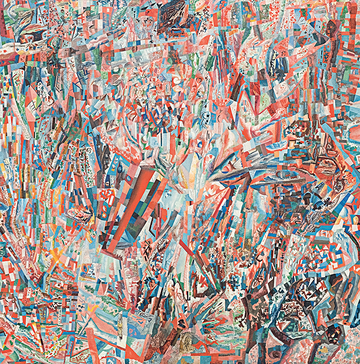 在这场政治上充满说服力、但美学上有时火力不够的,有关移民、殖民主义、经济不平等的大展里,你时不时可以发现另一场展览的蛛丝马迹。这场半隐半现的“秀中秀”关注的是那些旨在探索纺织物、声音实验以及记谱系统中某种图解式美学的艺术作品,那些努力捕捉也许可称其为“幻想”(visionary)的过程中飘忽不定的联觉机制的创作实践。在新美术馆(Neue Galerie)楼上,从俄国哲学家/画家帕维尔·菲洛诺夫(Pavel Filonov)绚丽的画布《宇宙(宇宙公式)》(1918–19)和《春之公式》(1922–23)到微分音音乐作曲家米哈伊尔·马秋申(Mikhail Matyushin)为未来主义戏剧《战胜太阳》(1913)所做乐谱那一段展览非常具有启发性,而连接两者的长走廊里,除了古典大理石雕像群以外,还有来自匈牙利萨满-诗人卡塔林·拉迪克(Katalin Ladik)1960年代末-1970年代的拼贴作品和声乐曲。所有这些作品都标示着某种内在或想象的世界,必须被放到一个狂喜恍惚的语境,而不是理性框架下来理解。不幸的是,这些精神性的图示作品大部分都被放在了玻璃展柜里,这种展示文献材料的传统手法束缚了艺术家们任性横溢的能量,让我不禁希望,策展团队在作品呈现上如果能像他们在整体展览结构设计上一样富有实验性就好了。
