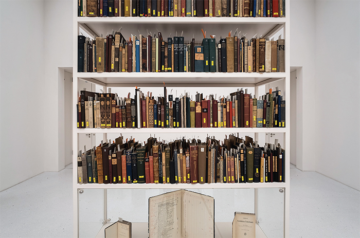 不过,这一沉重的单元却是整个展览里最强的部分之一,将德国-希腊主线放到了历史材料里,让我们回想起两个世纪之前出现的文化地理图景。1800年左右,古希腊牢牢地抓住了整整一代德国思想家与诗人的想象,这种对希腊世界的浪漫主义向往在西方传统中最具影响力的哲学家身上得到了传承,包括黑格尔和拿着纳粹党员证的马丁·海德格尔。在新美术馆对这一谱系的呈现中,我们看到了艺术史学家约翰·亚奥希姆·温克尔曼(Johann Joachim Winckelmann)——希腊美崇拜的创造者——斜躺在他的理想乡中;还看到曾经在传说中的1940年代初国家社会主义展览上展过的一幅媚俗的万神庙油画。美术馆一楼,彼奥特·乌兰斯基(Piotr Uklański)(你听说过的所有波兰艺术家都在这届文献展里)对他之前著名的装置作品《纳粹》(The Nazis)进行了一次令人不寒而栗的更新,1998年首展的“纳粹”系列由扮演第三帝国官员的演员剧照组成,而2017年的这件新作《真实纳粹》(Real Nazis)则汇集了大量真正的纳粹军人以及/或者党员的肖像照片,比如约瑟夫·戈培尔(Joseph Goebbels)、约瑟夫·博伊斯(Joseph Beuys),以及奥古斯特·桑德(August Sander)。一张出自格哈德·里希特(Gerhard Richter)之手的阿诺德·博德(Arnold Bode,文献展创始人)肖像挂在博德本人去希腊旅行时画的素描附近。同在一个展区的还有古尔利特家族几位成员的纸上和油画作品,这个特殊的家族因其臭名昭著的家族长——纳粹艺术商希尔德布兰特·古尔利特(Hildebrand Gurlitt)而为世人周知,希尔德布兰特在二战期间靠犹太家庭的没收财产聚敛了一大批现代主义艺术杰作。希姆奇克原本希望把古尔利特窃取的收藏放到本届文献展上展示,最终未能如愿。但是,对反犹太主义及罪恶感的这一考古学考察在一件有关纳粹劫掠物品的野心之作处达到了高潮。除了放满从犹太家庭窃取的书籍的大书架,玛丽亚·埃希霍恩(Maria Eichhorn)的这件作品还包括成立专门关注劫掠作品返还的新的研究机构等多种要素,堪称此次文献展的白眉之一。它的力量并不来自于什么空洞的概括,也不像部分其他作品那样,试图发表某种泛泛的道德宣言,比如玛尔塔•米努辛(Marta Minujín)在弗里德里希广场上荒诞的禁书万神庙。埃希霍恩的工作方法建立在与之完全相反的基础上:具体性。
