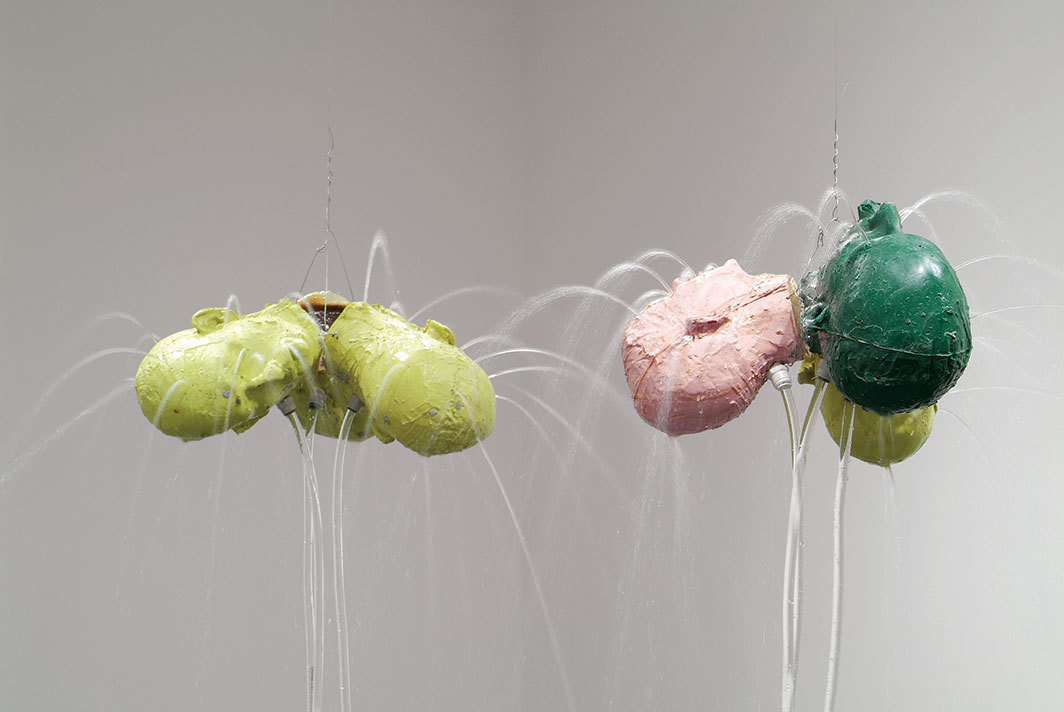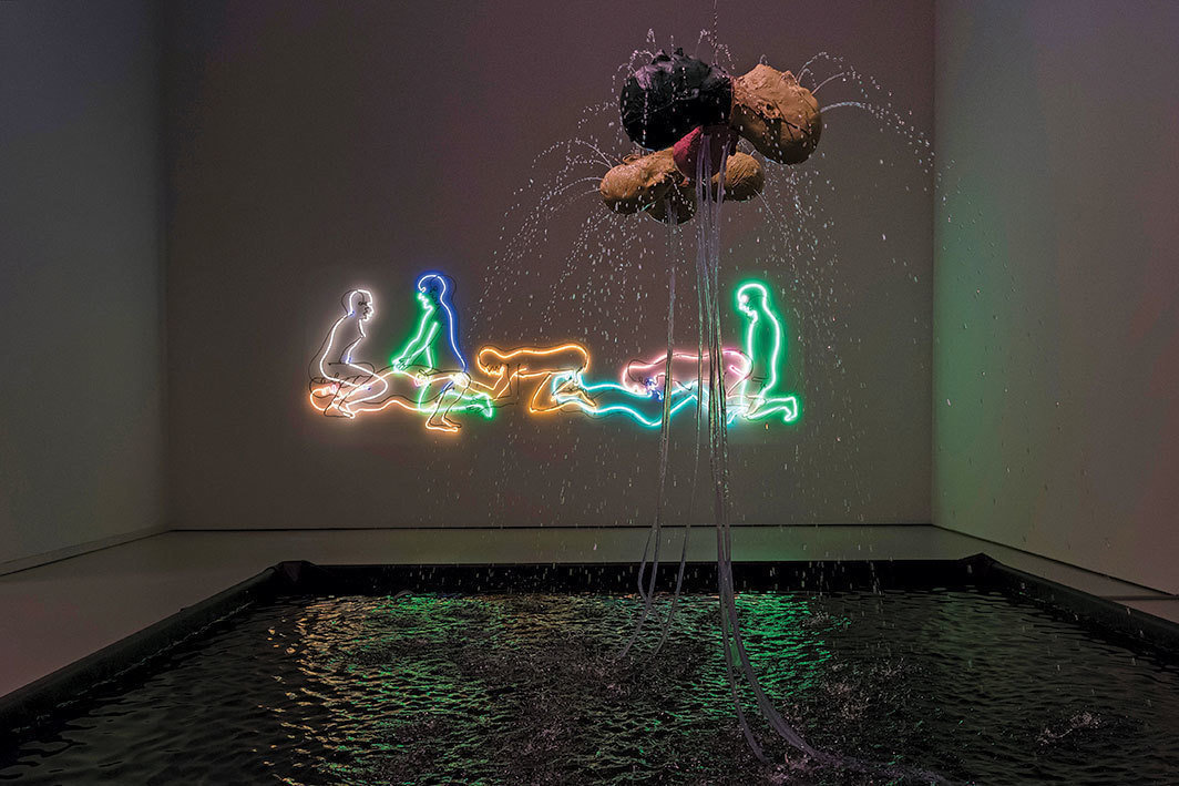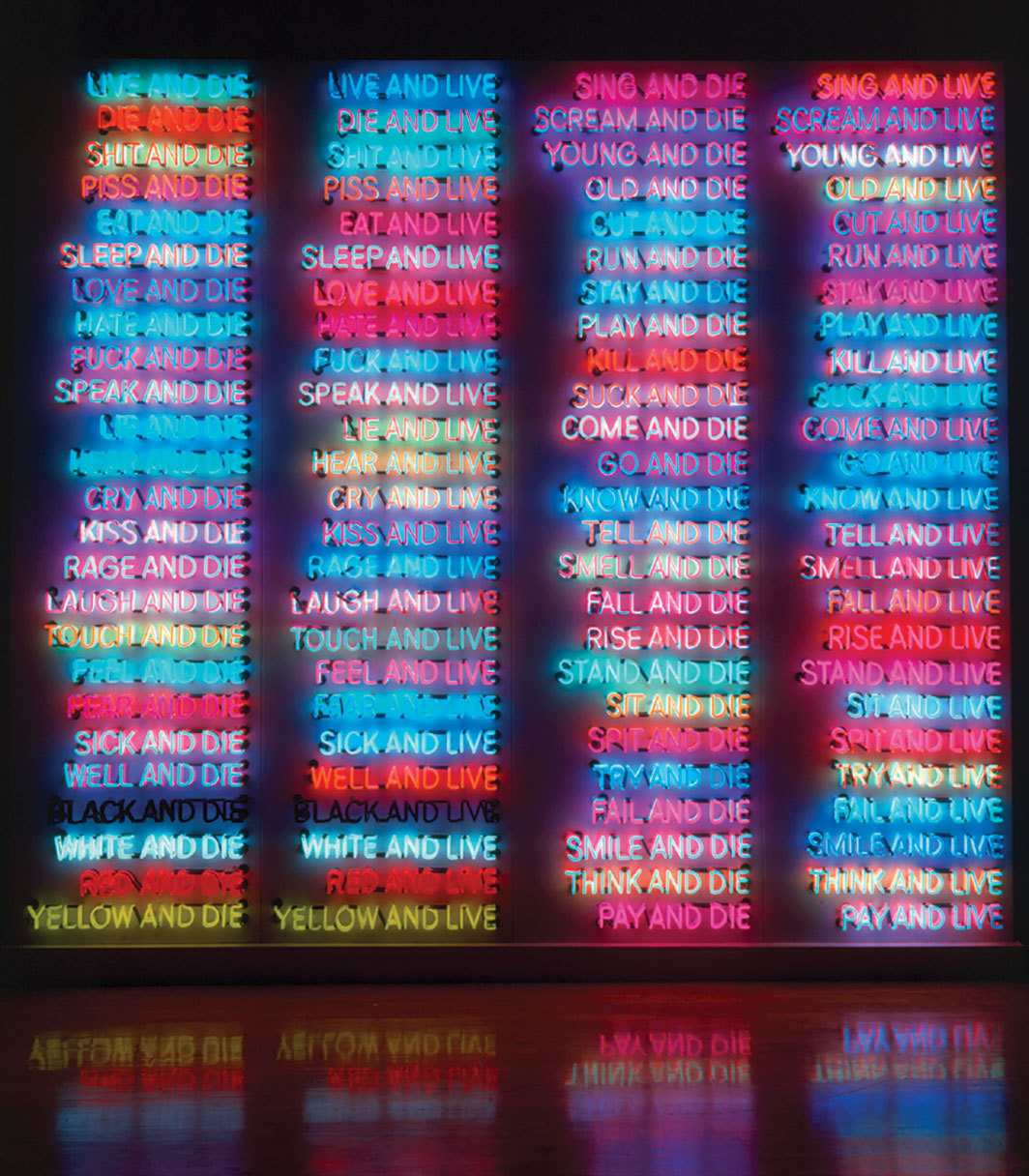 Schaulager博物馆地下展厅展出的一组作品尤其能够让人感受到,通过眼睛来控制对方并剥夺对方的人性是一种什么样的体验,像“白人直男”那样将目光变成武器又是指什么——只不过,这里被残忍对待和性别化的对象正是“白人直男”本身,而双重空洞的凝视则可能源自于任何人。一串用树脂和玻璃纤维制作的“头颅”被链条悬挂在天花板上,水流从其上多处刺破的伤口内流射出来,就好像大脑处于持续高产的狂喜状态中同时撒尿和射精(《三头喷泉(三个安德烈)和《三头喷泉(朱丽叶,安德鲁,林德)》,均创作于2015年》。巨型霓虹灯作品《七个人物》(Seven Figures, 1985)闪耀着艳俗的红、绿、蓝、黄光,这组多数为男性身体并呈水平饰带状的形态串联相扣,闪烁出做爱、舔吸和肛吻的姿势,有如一块八十年代的GIF动画原型。正像很多色情场景那样,富有性挑逗意味且性取向模糊的男性(在现实生活里很可能是直男)被雇佣表演令所有观众血脉喷张的行为,而这些光芒四射的霓虹光轮廓屏蔽了任何不被欲想的投影,这些去主体化的、实时的性交身体被悬置在一种“随便”的无关紧要的状态中。在对面墙上,播放着两部瑙曼于1969年拍摄的关于他的睾丸的黑白电影(《黑球》中睾丸被涂抹黑色颜料;《弹球》则展示了如其标题所指示的动作)。无精打采的阴茎被手移出画面,慢镜头制造的视觉效果强化了剪切的抽象和挥之不去的潮湿的色情凝视。如果说拥有一种愉悦完全由被侵犯的身体的碎片化所驱动的性主体让人情感能量尽失的话,那么这间展厅外面的作品《一百遍生存和毁灭》(One Hundred Live and Die, 1984)就把这种情感消耗进一步推向极端。作品里的指令使人联想到萨缪尔·贝克特和带点儿新世纪(New Age)味道的运动品牌广告(爱和死,恨和死,操和死,说和死,骗喝死…哭和生,吻和生,怒和生,笑和生,摸和生…)——文字在各种颜色组合中闪烁或熄灭,随着观看时间的延长,一种异化的、自动化的指令感变得愈发强烈,就像是连接语言和行动的回路开始绕过大脑的语言处理区域并且本能地服从命令;就好像专制管控变成一种无意识的条件反射。当然,这是可能的。瑙曼通过残酷地剥离其自身的掌控,使我们看到男性和白人身份在构建中对每个人——包括这种“特权”所假定的受益者——筑起一个不宜栖居的外壳,并使任何人都可能永久触及暴力并受其打击。