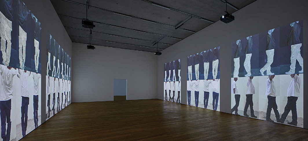 在瑙曼最具代表性的作品之一《用对立式平衡的姿态走路》(Walk with Contrapposto, 1968)以及他近期对这件作品的重访《对立式平衡研究1-7》(Contrapposto Studies, i through vii,2015-16)和《对立式平衡分裂》(Contrapposto Split,2017)中,一道裂痕出现了。当代的认同至上主义(identitarianism)喜欢把所有白人男性身体都视为同一种父权制力量中同等的组成部分,但如果我们不跟着这个思路走,就能开始看到权力的脆弱性,理解“白人直男”在无法达到那个强制性的完美标准时会变得多么不堪一击,以及这些焦虑能够表现出多么惊人的滑稽感与性欲力。“对立式平衡”的一个关键元素在于,“模特瑙曼”并不是一个经典的、理想化的男性身体:青年瑙曼太过消瘦,老年瑙曼太过松垮。另一个关键因素是,这种静止的姿态形式被强行放进了实时的时间性中。在瑙曼的雕塑、录像、霓虹灯作品里,我们一次又一次碰上堪比达芬奇笔下的维特鲁威人或勒·柯布西耶极简现代主义风格的模度人(Modulor Man)的解剖学意义上的理想几何形态,但都被怪异地分割成好几块。在1968年的录像里,“模特瑙曼”大摇大摆地在一条狭窄的通道中来回走动,他扭动着臀部,不断想要摆出典型的对立式平衡姿态,却始终不成功,前后持续了一个小时;在《对立式平衡研究1-7》中,瑙曼将数字视频丑陋的平面化质感推到了一个登峰造极的程度,观众直面的是壁画大小的图像,图像里,一具上了年纪的身体被水平分割——要么在肚子处一分为二,要么切成七份——分离的图像被放进切分平均的网格,男性的解剖形态被拆解得七零八碎,而且完全没有顾及经典、和谐的“黄金”分割比例。艺术家对数码影像效果的应用,传达出监控社会特有的那种冷漠而热切的审查感,它观看身体,并将其简化为可用来牟利的数据。如果以某种线性脉络来解读瑙曼的实践,我们也许会觉得《对立式平衡研究》通过勾勒衰老的身体,在一种衰老与青春的辩证关系中缅怀了更年轻、更灵活的身体;但旁观年轻一代面对与此相关的另一件作品时的反应却彻底颠覆了我的看法。在Schaulager博物馆,我恰巧看到了一群青少年与《走廊装置(尼克·怀尔德装置)》(Corridor Installation [Nick Wilder Installation],1970)进行互动的过程。这是一件曾让我感到窒息的作品。几乎能引发幽闭恐惧症的狭窄走廊中装有视频监控器,与之连接的显示屏上播放着实时监控图像。该作品以瑙曼在《用对立式平衡的姿态走路》里使用的走廊为模型,而且没有出口。我惊讶地发现,这群孩子进入走廊不但笑得前仰后合,而且很快就发现了一种对作品的误用方法。由于展厅内禁止摄影和使用手机,一个重要的视觉媒介和“现场”体验的传播平台没有了,青少年们灵机一动,把瑙曼这件原本着眼于自我-客体化的录像艺术作品的放大版转化成了一台临时的Instagram装置。他们一部分人聚集在一条走廊的显示屏旁边,另一组人则以最佳T台秀的姿态轮流从另一条走廊走过,赢得一片笑声和掌声。Instagram效应之所以奏效,正是因为这件作品结合了现场转播与围墙走廊制造的封闭视觉效果,非常类似社交媒体孤立、即刻的-现场图像制造方式,屏蔽其他一切以强化这一刻的影响力,同时激发即刻的肯定回应。