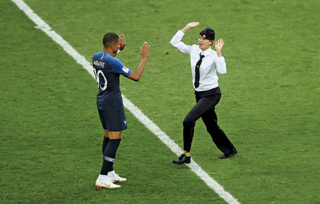 在今年6月莫斯科世界杯决赛的下半场,四位Pussy Riot成员飞奔穿越足球场。其中一位成员维罗妮卡·尼古尔什娜(Veronika Nikulshina)还成功地与法国明星球员基利安·姆巴佩(Kylian Mbappé)击掌。这些行动者装扮成为警察来通过安保,在场上制造了真正让人摸不着方向的效果。他们呼吁对俄罗斯当局罔顾人权的关注,这个介入行为被成千上万人看到了,成为一次强有力的大众媒体现场劫持。