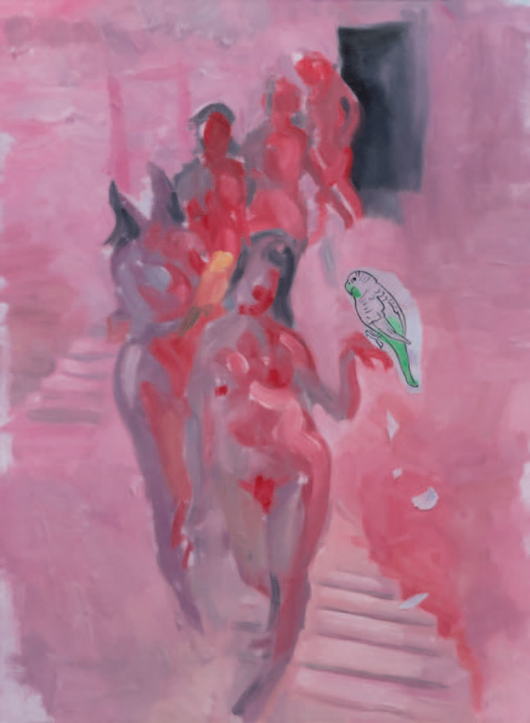 在Thomas Dane画廊位于伦敦公爵街3号的空间,漆成葱绿色的墙壁为传统的白立方空间增添了新的氛围。谢南星曾于北京尤伦斯当代艺术中心展出的《香料》系列(2016-17)在此能够被放到一种更广泛的阐释语境里看待。西方艺术史背景知识更丰富的伦敦观众也许可以看出《香料No.3》(2016)中经过若干变形的经典现代主义母题——下楼的裸女,从马塞尔·杜尚(Marcel Duchamp)、格哈德·里希特(Gerhard Richter)到亚娜·尤勒(Jana Euler)等一系列艺术家都处理过这一母题。谢南星用宽笔触涂抹的颜料刚好薄薄覆盖画布,所有限定性的细节都被抹去,只有一只鹦鹉是用细线勾勒,变成前景人物手旁的一个不协调的附加物。鹦鹉的异国情调破坏了这一现代主义母题的“真实性”。在“他者”眼中,西方经典也不过是又一种视觉资源。谢南星选择鹦鹉这一象征模仿行为的动物,不仅让人联想到曾使用过这一母题的众多艺术家,也投射了他自己的身份:也许西方人也会将他视作一位异国的模仿者,就像这只鸟一样。从这个意义上来讲,谢南星创作《香料No.1》(2016)的意图也许并不一定是为了与提香的《塔克文和卢克蕾提亚》(Tarquin and Lucretia, 约1570-76)相匹配。同样,他也没有将增加了图解箭头的《香料No.7》(2017)与卡拉瓦乔的《以马忤斯的晚餐》(The Supper at Emmaus, 1601)对等。相反,谢南星希望强调他对欧洲经典的开放认可和无负担的态度,从而重塑这一传统。