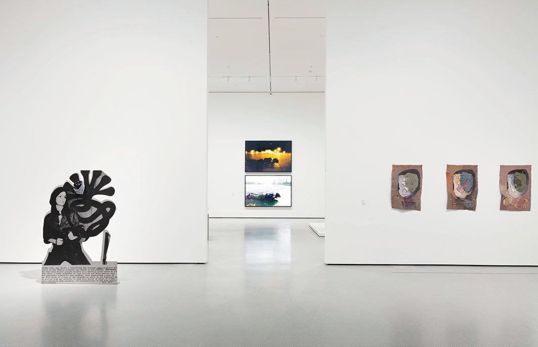 既然我已经开始赞美了,那么请允许我特别指出,二楼当代厅的策展工作完成得尤其精彩,我们可以看到圣戈·南古地(Senga Nengudi)墙角那件蔚为壮观的作品和玛瑞安·海森格(Maren Hassinger)更为微妙的雕塑共处一室。的确可谓“就在中城区上”(Just Above Midtown)。这种搭配感觉就像是新版的毕加索和布拉克。但是,如此并置并不仅仅是用亲密感和姐妹情来纠正历史错误。展间的布置方式使得观众在观看海森格安置在地板上的成片捆扎钢筋束之时就会瞥见即将到来的一切:卡迪·诺兰(Cady Noland)的模切和丝网印刷金属雕塑,描绘了派翠西亚·赫斯特(Patty Hearst)身着共生解放军(Symbionese Liberation Army)武装的身影。(实际上,我开始把这件作品错认成了她的奥斯瓦尔德[Lee Harvey Oswald]雕塑之一——这就是诺兰的强大能力所在,她善于分离出美国这个国家的暴力也善于将其混合。)从同一视角可以看到琼·塞梅尔(Joan Semmel)的大型裸体自画像,该画像与南古地以及海森格的作品同处一个空间,充当了从1970年代标志性的自我关注到1980年代紧随而来的反女权主义之间的剧烈的转折点。当你从一个房间移到另一个房间时,诺兰始终没有离开你的视线范围,而你会发现一个美丽而令人心碎的安娜·门迭塔(Ana Mendieta)的雕塑,这是一个女性形体的浮雕式表达,看起来好像是用泥巴做成的,平躺在一个低矮的基座上。我从来没有想到过可以把门迭塔和诺兰放在一起。不过这些作品中体现出的那种舞台布景式的扁平感——对无体量的雕塑的探索——也提出了这样一个问题:如果将身体视为空洞,那么外壳就可能缩减成纯粹的图像。
