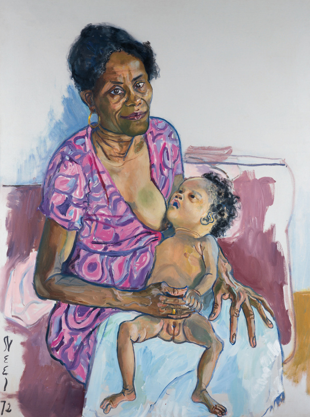 但拉康忘记,或者他只是不感兴趣:当自我认知的欣喜场景在母亲怀中发生时,怀抱着婴儿的母亲看到了什么。尼尔没有忘记。母亲并没有因为孩子可能对她视而不见而消失。母亲看到了。她看着另一个人蜕去甲壳,试穿新的自我轮廓。在她几乎所有的肖像画中,尼尔本人成为了描绘对象所观看的镜子。在1967年的《南希与奥利维娅》(Nancy and Olivia)中,爱丽丝看到了她的儿媳南希,并以一种对后者成为母亲后新出现的紧张和危机感同身受的方式描绘她。在直面自己诡秘而受缚的自我时感到惊讶的不仅仅是婴儿。但尼尔的儿媳们(在艺术家的笔下,她们纷纷流露出“我招架不住了”的表情)是如何看待她们的婆婆的呢——这个嫁给古巴画家的波西米亚,先是搬到哈瓦那,后来定居纽约哈莱姆区,和三个不同的男人有四个孩子,失去了其中两个,在贫困之中养育抚养另外两个,大儿子还患有营养不良。