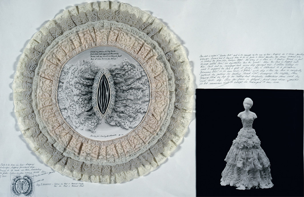 芝加哥最具标志性的作品《晚宴》(The Dinner Party,1974-79)没有出现在现场展出的150件作品中,它是布鲁克林博物馆的永久馆藏,无法出借。不过在笛洋美术馆(M.H. de Young Museum)的展览上,我们可以看到这件作品的测试版本以及其他档案。《晚宴》是一件“巨型”作品。在包括织工和陶艺家在内的数百名志愿者协助下,艺术家花了五年时间完成了这件作品。它由三张48英尺长的桌子组成,呈三角形排列,每张桌子都有39个座位,每个位子都献给一位神话或历史中的女性人物。 大多数餐盘都装饰有风格化的外阴图形。艾米莉·狄金森(Emily Dickinson)的是粉红色的花边。而玛格丽特·桑格(Margaret Sanger)的则看起来像一只不祥的红色龙虾。另外还有999位女神和女性的名字写在装置的瓷质地板上。
