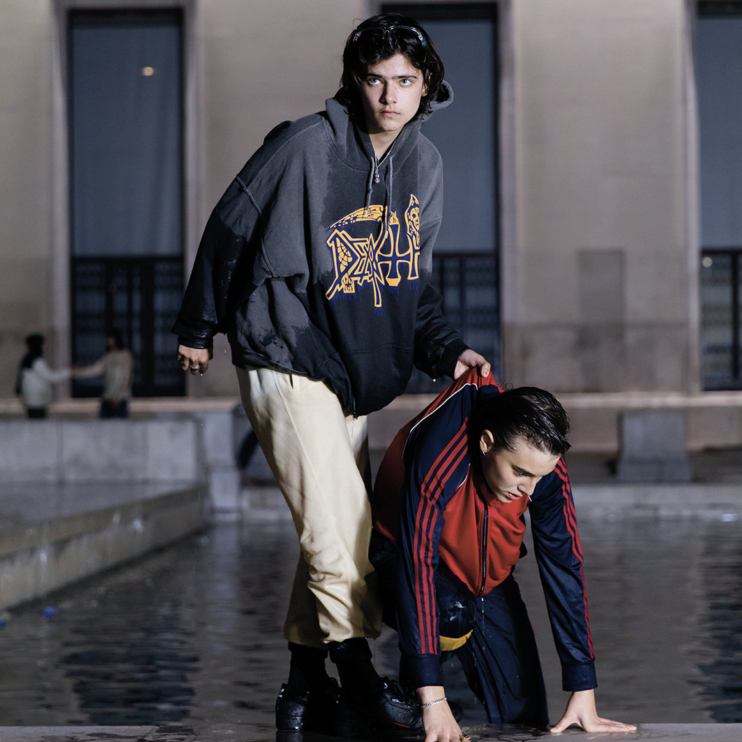 后一种意义上的“将生命压缩为图像”是伊姆霍夫的《静物》最重要的支撑概念,尤其是表演免费对公众开放,而且长达四个小时——这是伊姆霍夫作品的特色,都让它非常社交媒体友好。无论从哪个角度来看,这些活人静物画都是为了观众而存在的。以进场的过程为例,一群表演者以极其缓慢的速度把观众带入大门,这场面更像是某款视频app做出来的效果,而非发生在真实世界。另一位表演者以同样缓慢的速度登上一艘超现实的人体筏子,并且“漂流”了一段距离。伊姆霍夫的表演者们身着90年代亚文化的“制服”(黑金属/滑板文化/复古帽衫),直击怀旧情绪的核心,他们看起来就像千禧年之前的美国郊区青少年,这些形象又在拉夫·西蒙斯(Raf Simons)、德姆纳·格瓦萨里亚(Demna Gvasalia)和山姆·莱文森(Sam Levinson)编织出梦境里被一再放大。