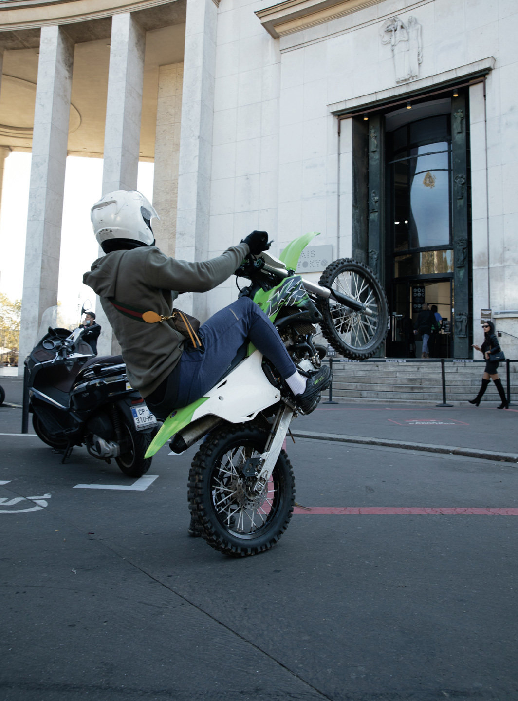 仅是从其动用的机构资源来看,这个展览的配置就已经让人联想起早期的艺术系统:策展人艾玛·拉维尼(Emma Lavigne)和维多里娅·玛塔雷赛(Vittoria Matarrese)邀请伊姆霍夫参与东京宫的“白板”(Carte Blanche,该项目开始于2007年,首展艺术家是乌戈·罗迪尼[Ugo Rondinone])系列,这意味着这位德国艺术家可以完全自由地使用这个欧洲面积最大的当代艺术中心(236,806平方尺)。伊姆霍夫也毫不客气地要求把场馆内部清空至只剩下房梁和结构墙;画满涂鸦的玻璃是从一间已经夷平的都灵工厂拆卸和运输来的;此外展览邀请了超过三十位表演者和参与者(包括巴黎当地的滑板玩家,一位训鹰者,还有专业拳击手伊布拉西马·科纳特[Ibrahim Konaté]的机车爱好者团体K-Team,每次表演开始前他们都会集体飙车前往东京宫所在的时髦的16区)。艾利萨·道格拉斯(Eliza Douglas)为展览谱写了音乐,失忆扫描仪(Amnesia Scanner)乐队的维尔·海马拉(Ville Haimala)负责声音设计和制作,还有保罗·B·普雷西亚多(Paul B. Preciado)的文字,这位作家声称自己会是“展览的有机构成部分”而非单纯的艺术论评者。除此之外,伊姆霍夫还集合了另外28位艺术家的作品,包括早期现代主义媒材明星(杰利柯[Géricault]、德拉克罗瓦[Delacroix]、迈布里奇[Muybridge]),标志性战后画家(西格玛尔·波尔克[Sigmar Polke]、琼·米切尔[Joan Mitchell]、塞·托姆布雷[Cy Twombly]),后资本主义心灵主义者(大卫·哈蒙斯[David Hammons]、麦克·凯利[Mike Kelley]和斯图尔特文[Sturtevant])。自从克里斯多和让娜-克劳德(Christo and Jeanne-Claude)1995年包裹德国国会大厦以来,还未出现过此类艺术家和建筑物的共生组合,同样罕见的是将如此巨大的文化资源用作如此惊人的用途。