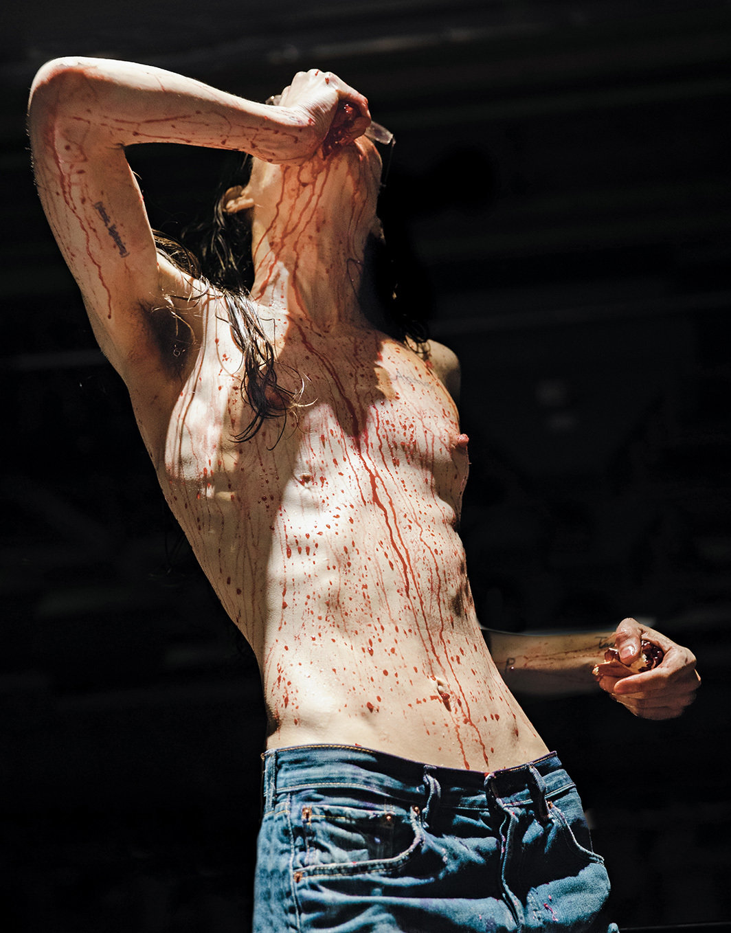 表演者阵容也不容小觑(包括弗朗西斯·其亚佛尼[France Chiaverini]、香坦·符[Chantel Foo]、乔什·乔纳森[Josh Johnson]、、凯尔文·基伦佐[Kelvin Kilonzo]、米奇·马哈尔[Mickey Mahar]、卡尔·鲁本·诺尔[Karl Ruben Nöel]、提尔曼·欧多纳尔[Tilman O’Donnell]),他们将数十年来的专业肢体语言经验带入了展览。22位表演者在东京宫混凝土下沉大厅或静止不动或持续穿越(在一个催眠般的场景里,他们湿漉漉地穿过了户外的喷泉),甩动头部,用热蜡油或者塑料壶里的水为彼此施洗,飘过、扭动、游荡、舞台跳水、回旋踢、风车转,伴随着的是道格拉斯那幽灵般的嗓音和吉他演奏,以及开创性巴西死亡金属乐队神碑(Sepultura)鼓手依高·卡瓦来拉(Igor Cavalera)间歇性的、足以诱发恐慌症的鼓点。你几乎不可能克制住掏出手机的冲动——拍照、发布、“提取”(distill,换言之,杀死/kill)。