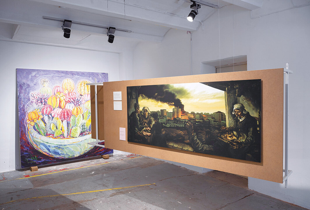 如果说恩维佐一丝不苟地质疑了策展权力关系,那么ruangrupa则是对策展能在多大程度上被分散和去中心化进行测试。在这次的文献展上,每个展览附有的文字材料有着显著的不一致。在WH22,由加沙团体Eltiqa和来自拉马拉的“米仓”成员“资金问题”(the Question of Funding)策划的现居加沙的艺术家绘画展经过了深思熟虑,提供了大量墙面标签、印刷品,甚至还有一条有详细注解的自1948年巴勒斯坦大逃亡(Palestinian Nakba)以来发生的各大历史事件时间线,其中交错着个人轶事,强调艺术家们所处的政治经济环境。在Ottoneum自然历史博物馆,在马德里、马洛卡和西班牙北部山区运作的团体INLAND展出了很多与西班牙高原乡村生活相关的物件,而展品旁所附的小卡片上印的文字段落读起来更像随手写下的研究笔记。