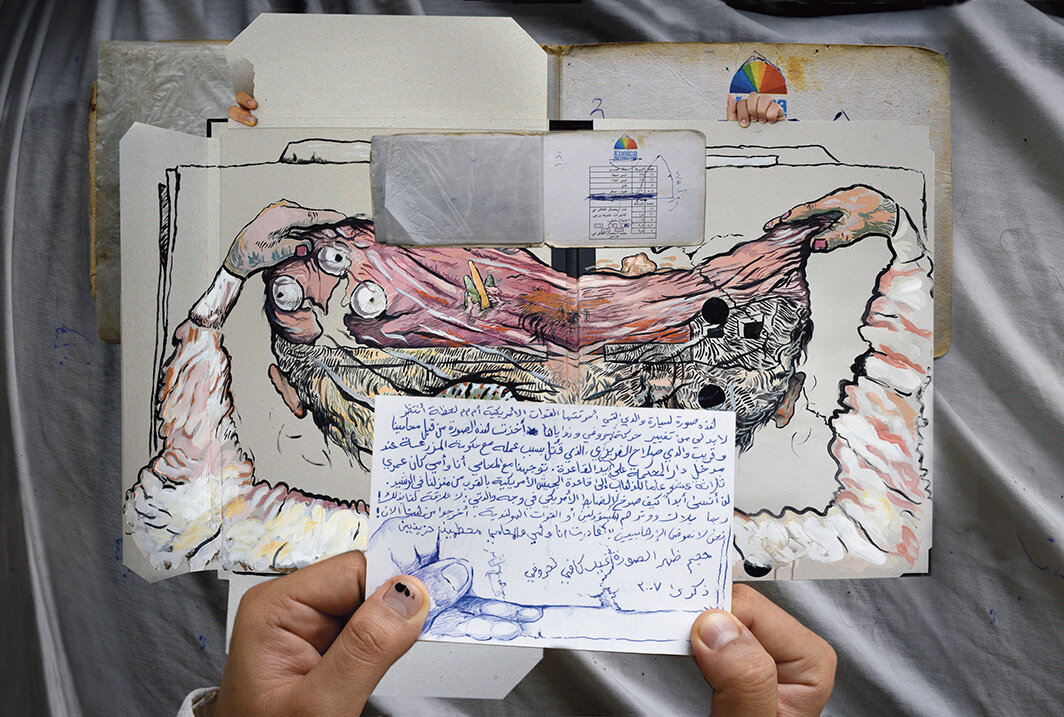 尽管困难重重,当代伊拉克仍出现了让我保持希望的优秀人才。阿里·艾亚尔(Ali Eyal,出生于1994年)在入侵期间还是一个生活在巴格达的孩子,在他温柔的作品中,他既捕捉到战争冲突噩梦般的荒谬,也捕捉到了幸存者生活中更亲密的一面。他以不同媒介(通常以绘画为重点)编织多彩的故事,通过混合日常和超现实元素来调和他所目睹的痛苦事件,讲述伊拉克人处理战争创伤的方式。在以大型灯箱形式呈现的拼贴作品《6x9不能装下一切》(6x9 doesn’t fit everything,2021)中,他将草稿、相册和打开的文件夹的复制品叠放,暗示一个未解决的案件。作品标题的意思是,没有任何框架能够完整捕捉侵略后发生的事情的规模。艾亚尔本人在2006年失去了父亲和几位叔伯,他们都消失得无影无踪。在这件作品的前景中,艺术家双手拿着一张照片的背面,也许照片内容是他父亲被燃烧弹袭击后的车,但观众无法看到正面,只能看到艾亚尔在照片背面写的一段话,回忆了他在童年时遭遇美国军队的记忆。照片后方是一幅画,展现了艾亚尔独特的令人不安的视觉语法,其中作为大屠杀隐喻的解剖学图像与植物学图像交织,上演了艾亚尔创造的无意义替代性阴影世界“农场”(The Farm)。通过这种高度个人化的语言,艺术家坚定地将被隐藏或压制的叙述带进公众的意识之中。