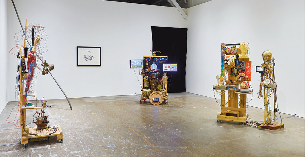 休伯曼的展览标题借用了已故自由爵士鼓手、艺术家、博学多才的米尔福德·格瑞夫斯(Milford Graves,1941–2021)的作品名,后者曾经设计了一台自制心电图仪,以人类不规则的心跳为灵感来创作乐谱。(“扔掉你的节拍器吧,倾听你的心跳”,他曾这样恳求其他音乐人)。他的混合媒材雕塑《无限可能之路:骨架》(Pathways of Infinite Possibilities: Skeleton,2017)位于第一展厅内,其中,一具人类骨架肩挎着一只刻有作品标题中的短句的鼓;在它胸前的显示屏上,播放着一段心脏跳动的录像。