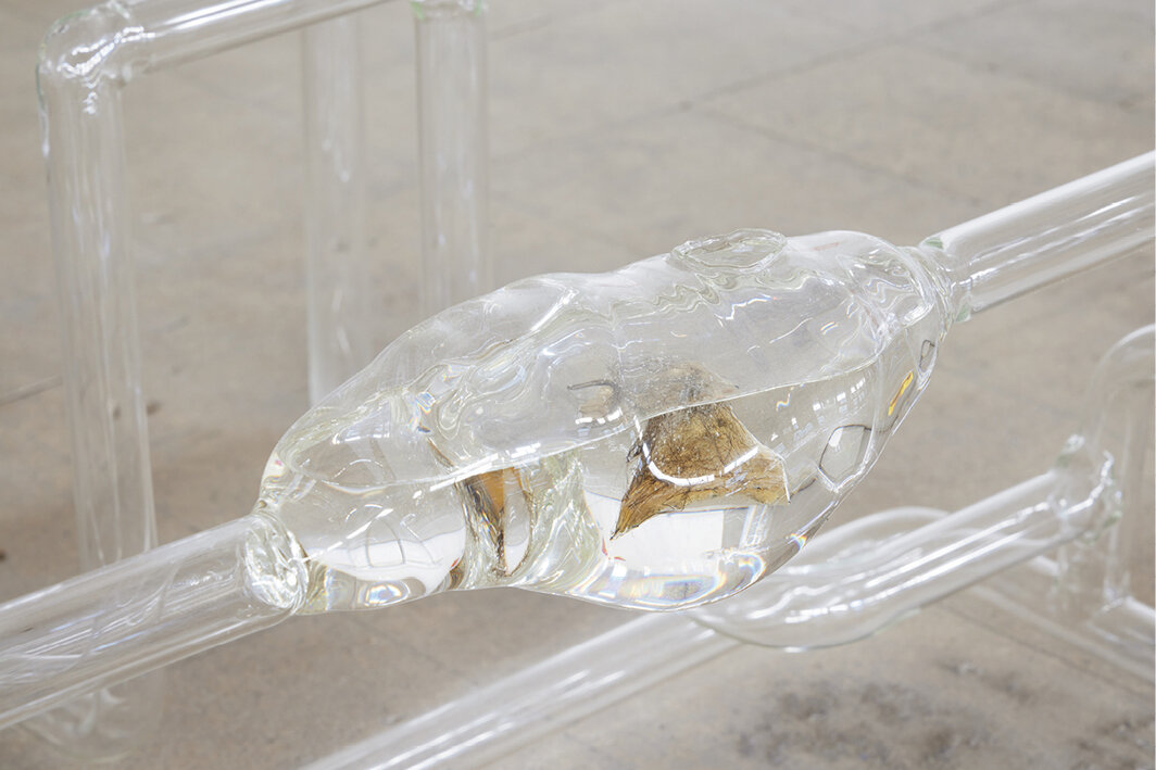 范加在凹陷下坠的吹制玻璃球中填充半透明的硅胶——这也是常用于美容或整形外科手术的软组织替代物——并向其中注入能同时唤起迷恋和恐惧的真黑色素。作为展现自然和文化交织的窗口,这些光滑的容器的内部现在布满了纹理和斑点,展现种族的建构。在这种材料的投射意义下,玻璃容器如枯萎的饲养箱般下垂。在2018年的“系统”(Systems)系列中,艺术家将这些囊泡与其他含有现成化学物质的玻璃囊泡一起展示,包括艺术家在自己性别转换期间开始研究的药用雌激素和睾酮等。在美国一些州政府禁止性别认定护理(gender-affirming care)的同时,这些荷尔蒙以残酷的力度被商品化、立法化、病态化,它们与保罗·B·普雷西亚多(Paul B. Preciado)所称的“药物色情时代”(pharmacopornographic era)相关:在这个时代,控制和抵抗在生物分子层面上运作。范加将各种不同的玻璃球排列在肉感的、涂有树脂和硅涂层的支架上,让人联想到这些分子通常会经过的层层叠叠的复杂系统——包括化学、医疗、法律、信息、技术、经济和生物政治等。而“系统”雕塑悬停了它们的流动,暗示着重新构想或在字面意义上重构这些物质的可能性:它们可以被侵入、扰乱、变得难以管理。
